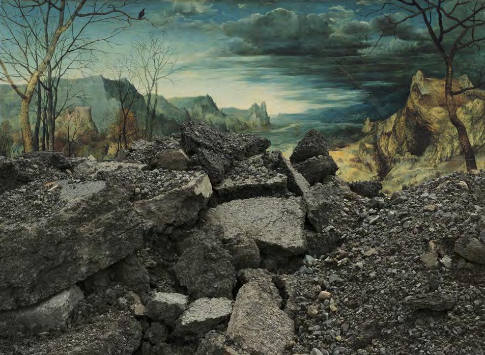 Doug Dumais, A Landscape for Construction (Return), 2020, inkjet print on Entrada 300 White, 60 x 80 cm, Background image: Pieter Bruegel the Elder (Dutch, 1525–1530 - 1569), The Return of the Herd, 1565, Oil on wood. 117 cm × 159 cm (46 in × 62 1⁄2 in), Gemäldegalerie, 1018, Kunsthistorisches Museum, Vienna.
