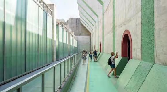 Existing ventilation shafts are transformed into vertical light-and-sound wells, guiding both airflow and resonance between the underground and street level.