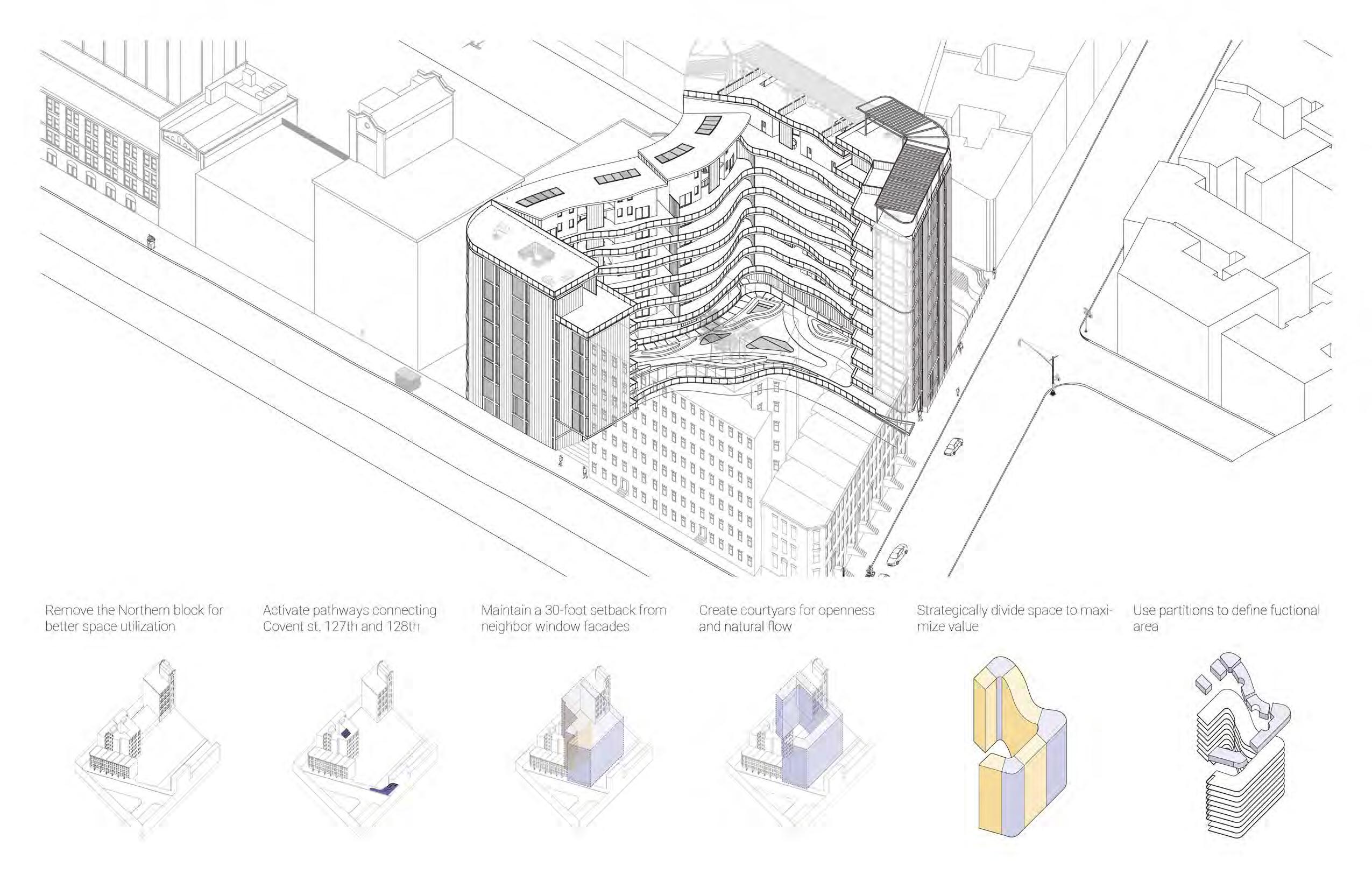 Located at the intersection of Covent St, 127th, and 128th, this multigenerational housing project explores the ideology of intimacy through architectural space. Comprising 103 apartments across 10 floors, it is situated in a diverse, multi-ethnic, and multi-generational neighborhood.