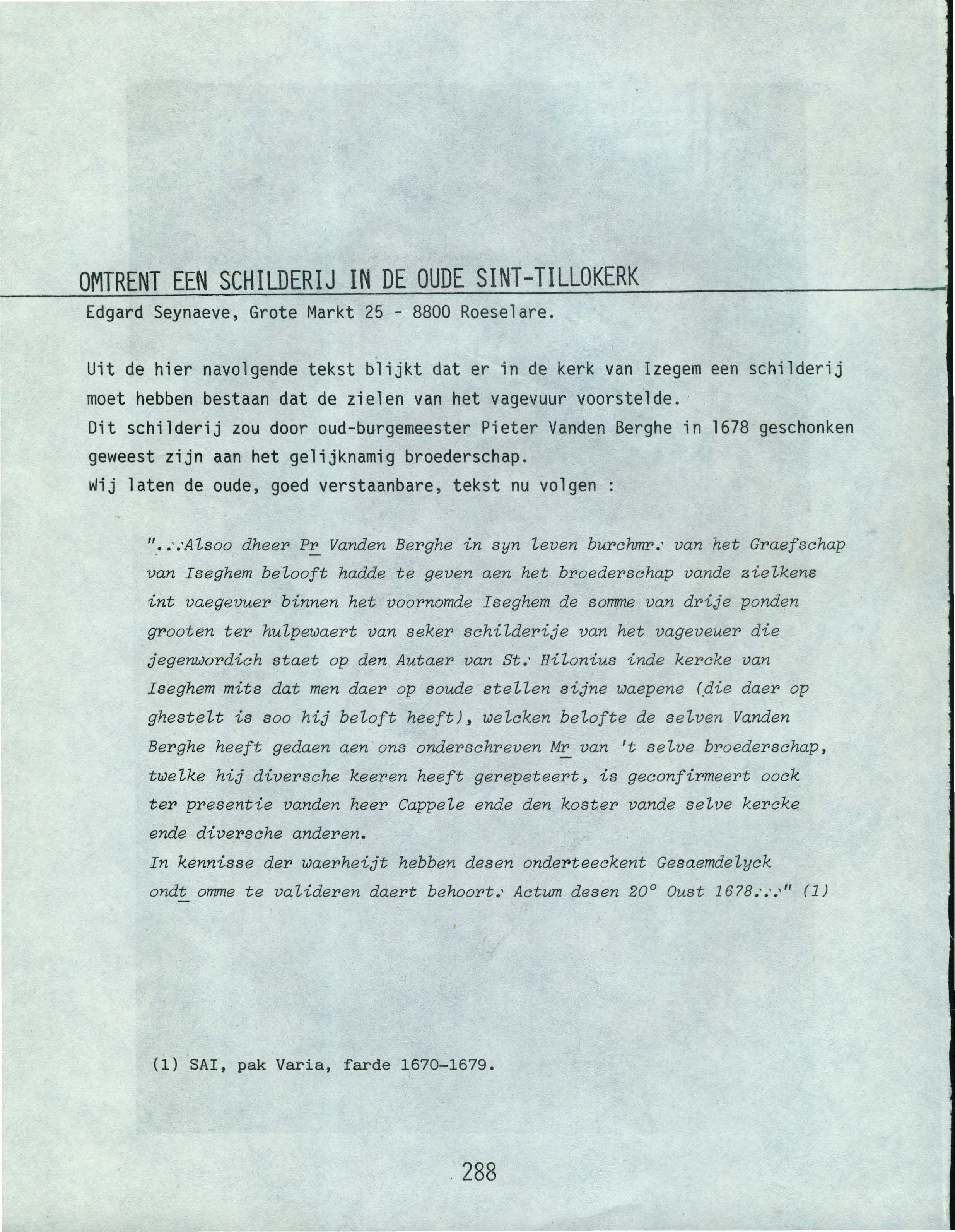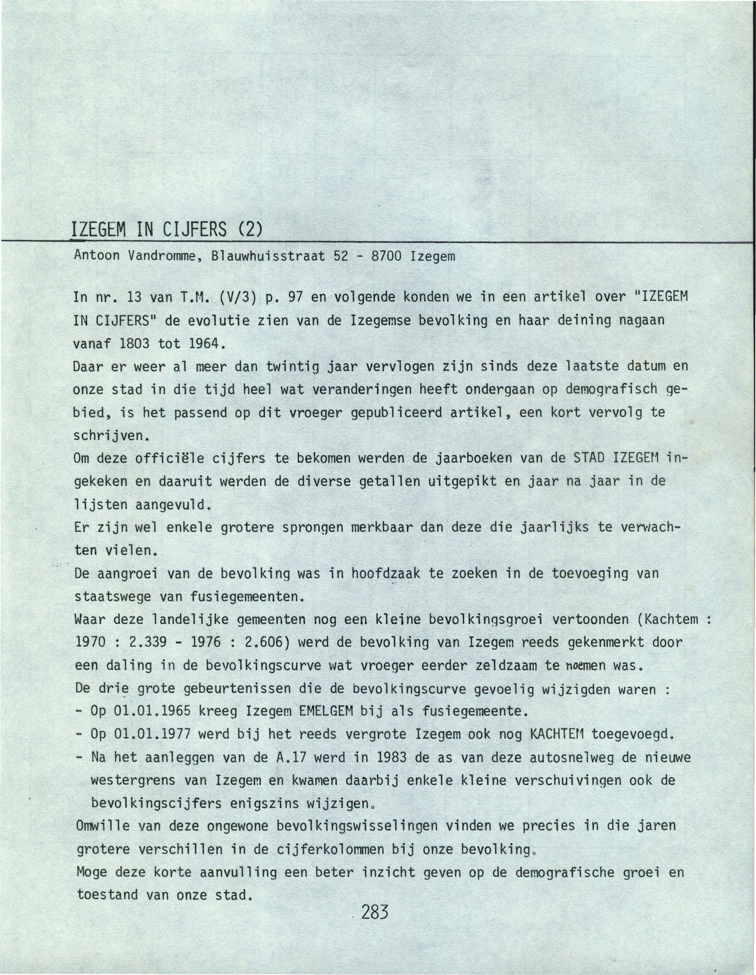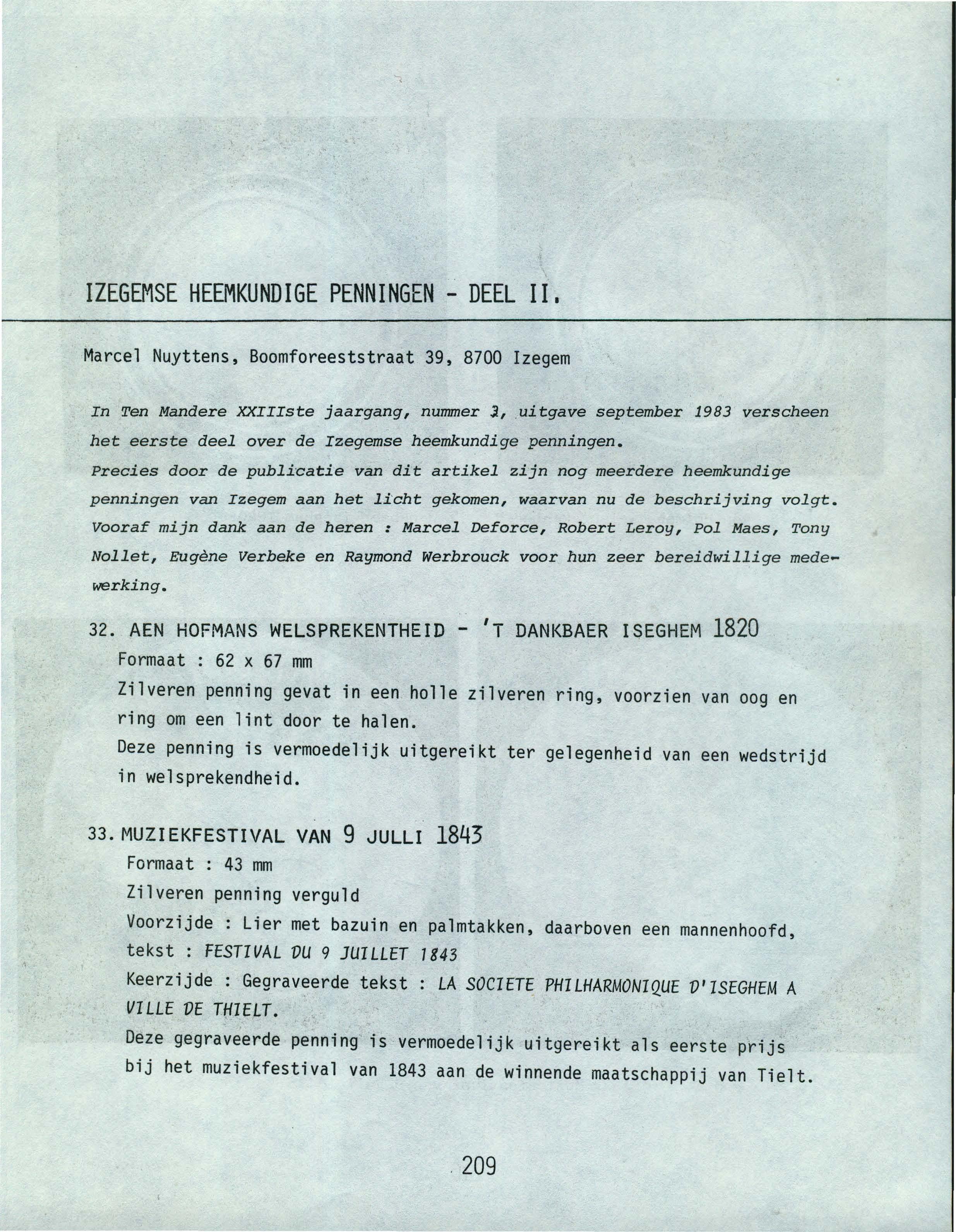 Alle oude geschriften, boeken, foto's, kaarten e.a. betreffende Izegem, Emelgem en Kachtem wor den steeds met dank aanvaa rd bij alle leden van het Bestuur of op het stadhuis , 1e verdieping , bu r ea u nr 3.