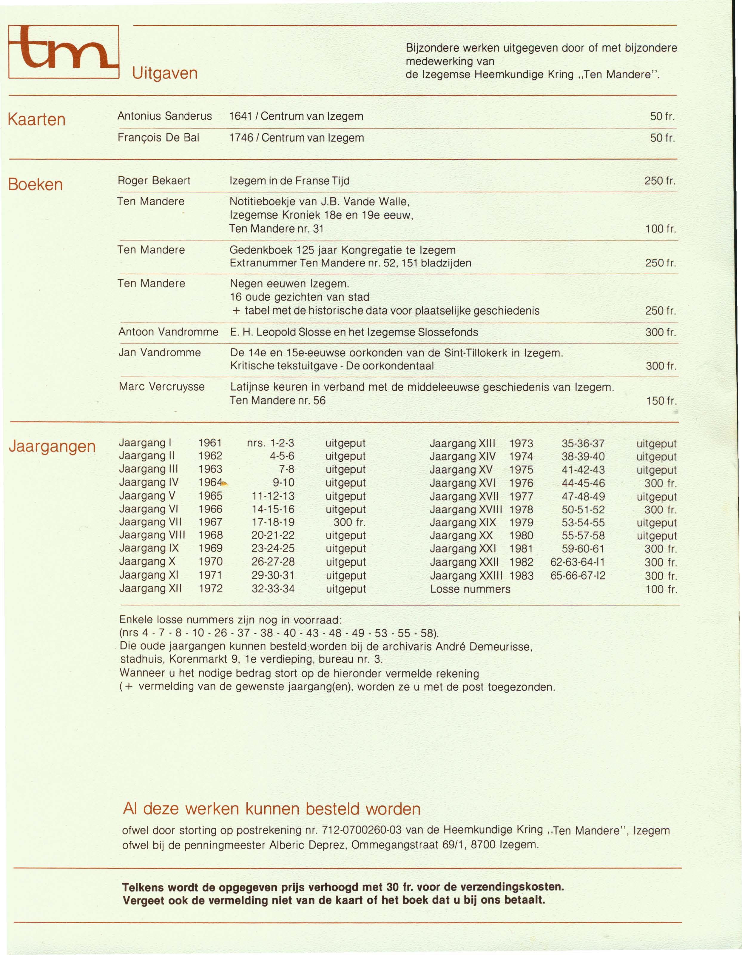 ofwel door storting op postrekening nr 712-0700260-03 van de Heemkund ige Kring "Ten Mandere " , Izegem ofwel bij de penningmeester Alberic Deprez , Ommegangstraat 69/1, 8700 Izegem