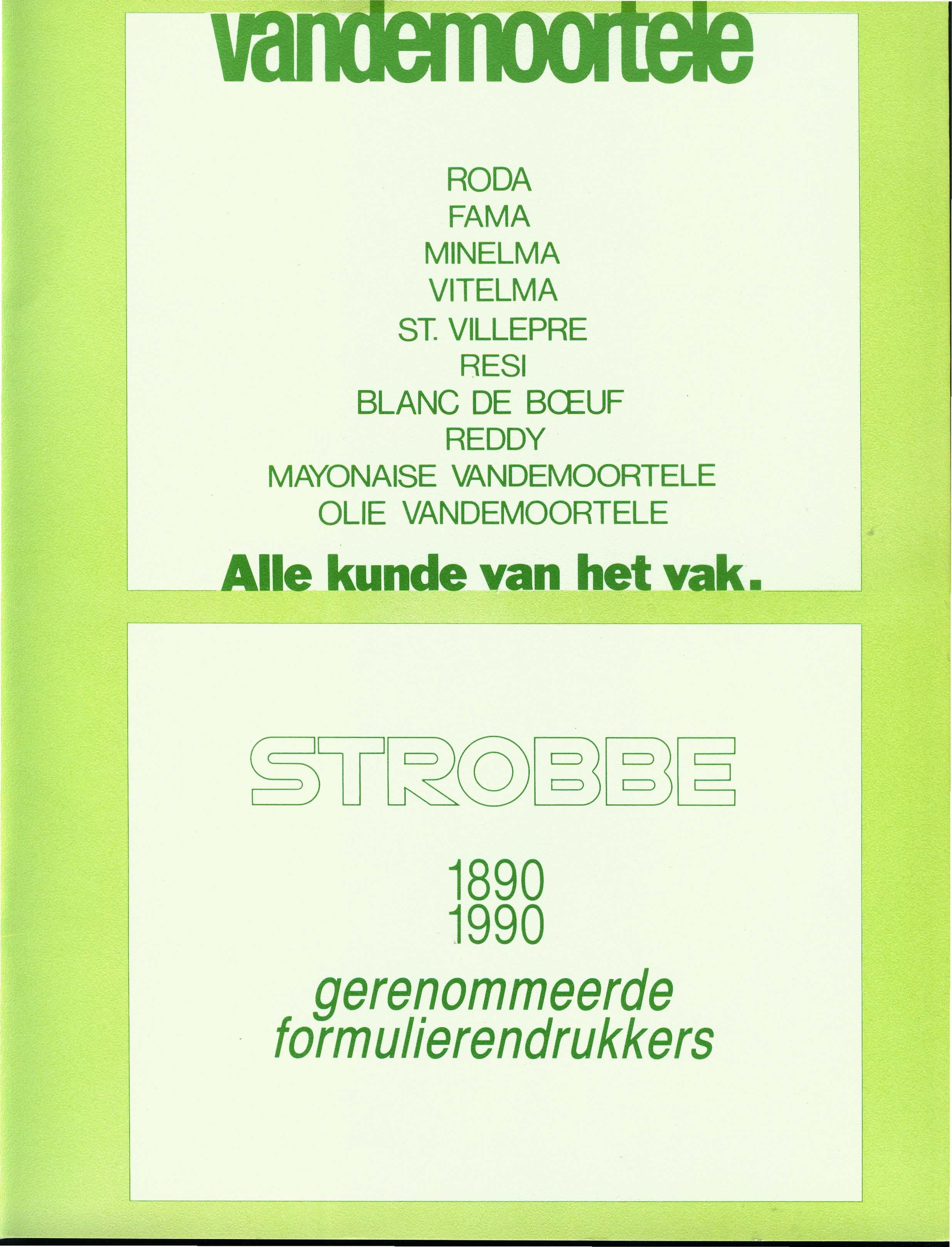 RODA FAMA MINELMA VITELMA ST. VILLEPRE RESI BLANC DE BCEUF REDDY MAYONAISE VANDEMOORTELE OLIE VANDEMOORTELE kunde van het vak • . 1890 1990 gerenommeerde formulierendrukkers