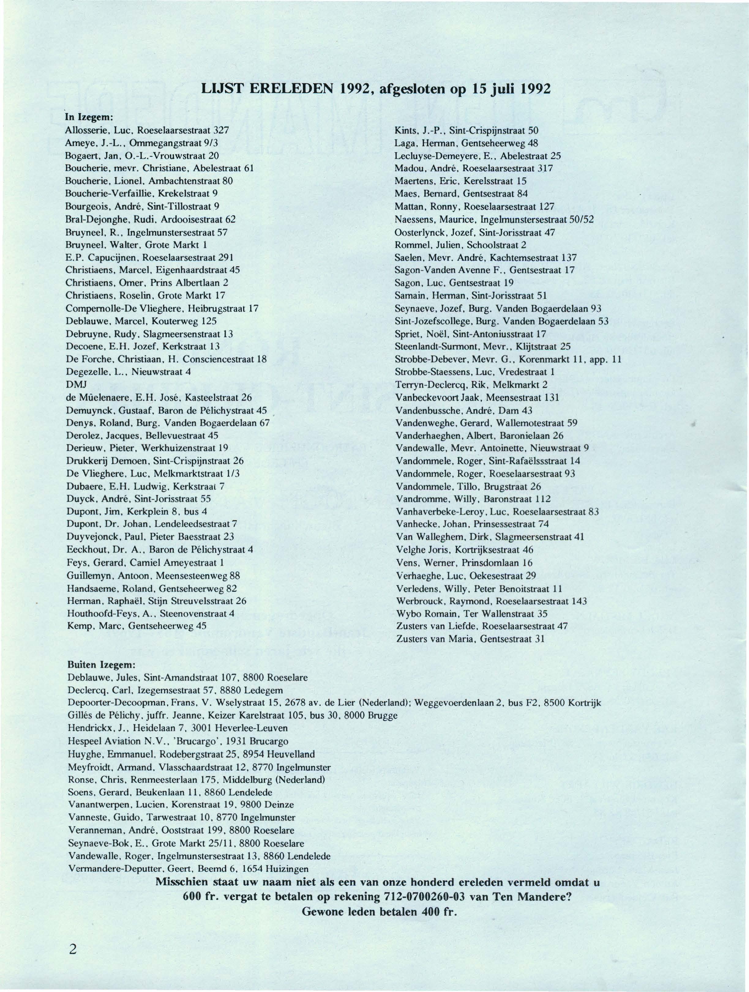 Depoorter-Decoopman. Frans. V . Wselystraat 15. 2678 av o de Lier (Nederland) ; Weggevoerdenlaan 2. bus F2. 8500 Kortrijk Gillés de Pélichy . juffr. Jeanne . Keizer Karelstraat lOS . bus 30 . 8000 Brugge Hendrickx. J Heidelaan 7.3001 Heverlee-Leuven Hespeel Aviation N . V .. Brucargo ·. 1931 Brucargo Huyghe Emmanuel. Rode\>ergstraat 25. 8954 Heuvelland Meyfroidt Armand. Vlassch,aardstraat 12. 8770 Ingelmunster Ronse. Chris. Renmeesterlaan 175. Middelburg (Nederland) Soens. Gerard. Beukenlaan 11. 8860 Lendelede Vanantwerpen . Lucien . Korenstraat 19. 9800 Deinze Vanneste Guido. Tarwestraat 10. 8770 Ingelmunster Veranneman. André Ooststraat 199. 8800 Roeselare Seynaeve-Bok. E Grote Markt 25/11. 8800 Roeselare Vandewalle. Roger. Ingelmunstersestraat 13. 8860 Lendelede V ermandere-Deputter. Geert. Beemd 6. 1654 Huizingen