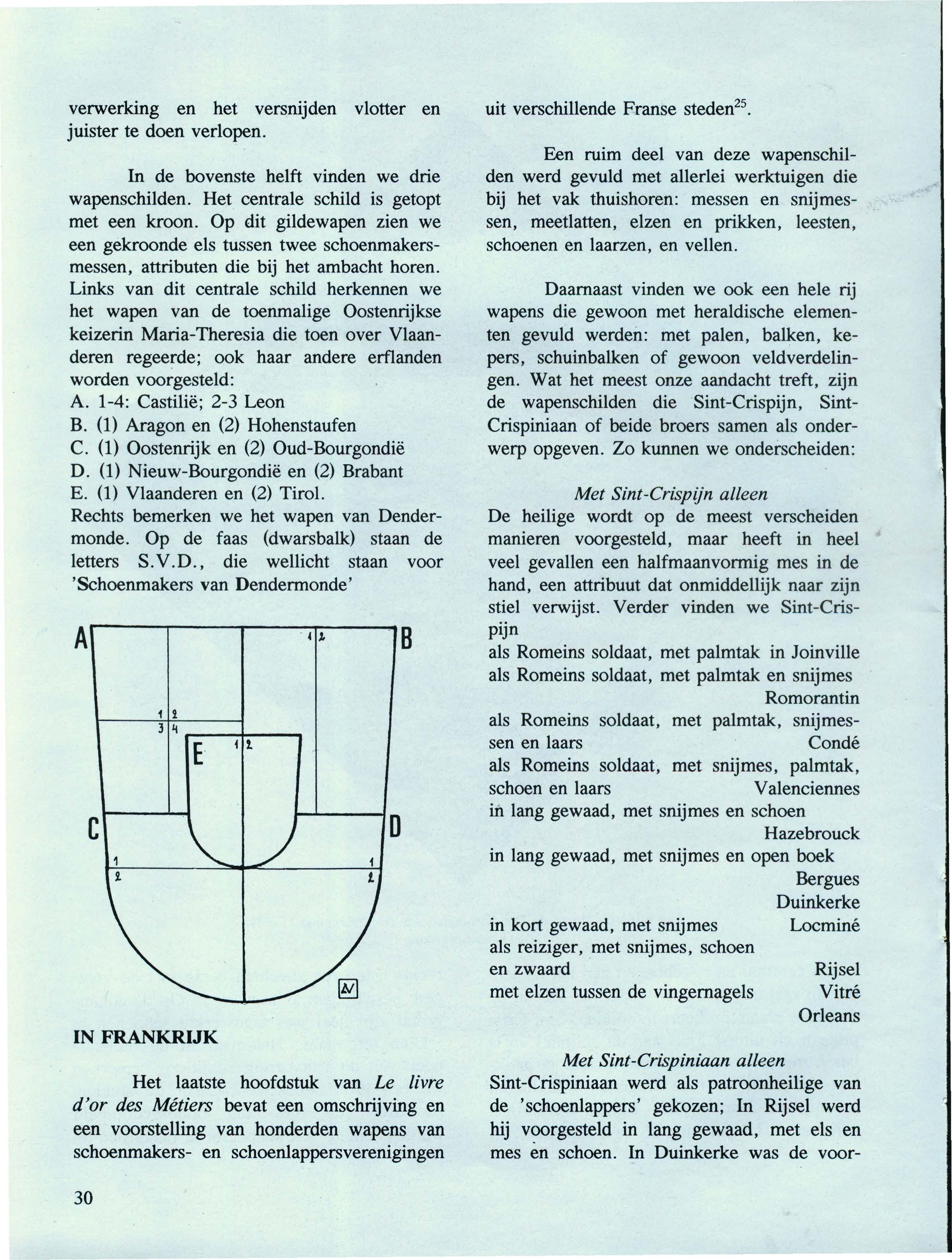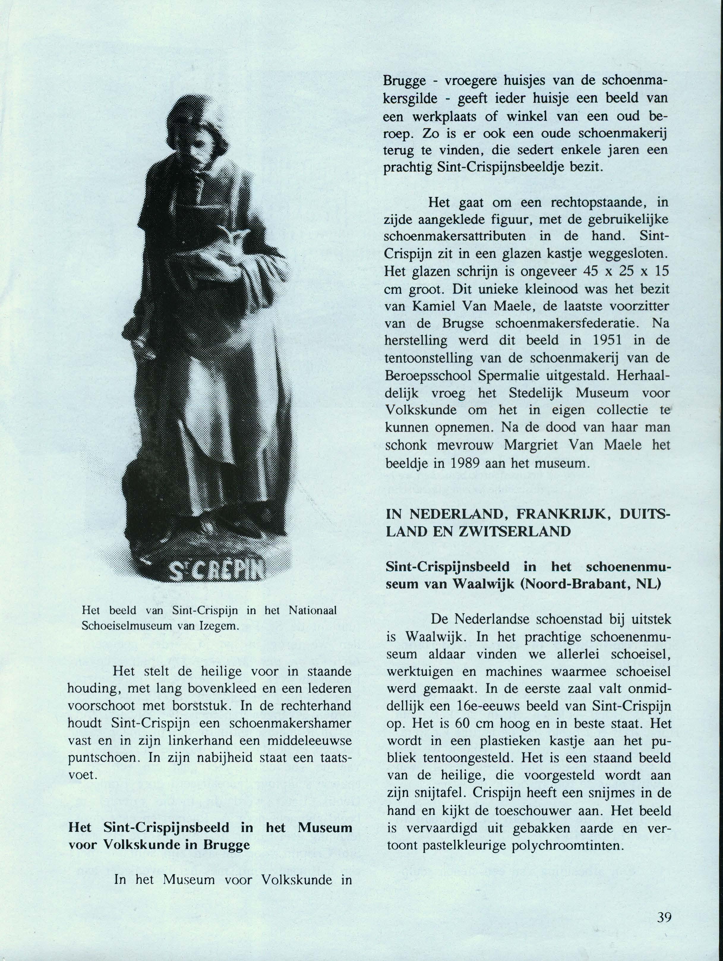 A VANDEWALLE e.a., De Brugse schoenmakers en timmerlieden. De ambachten en hun huizen 04e-20e eeuw) Brochure uitgegeven door de KB bij de 50e verjaardag van de bank, 1985. Ant. VANDROMME, De schoenmakersfolklore, nr. 25 (9/3), p. 31-33. André VER ELST, Folkloristische tijdspiegel voor België, Brussel, drukkerij Is. Mertens N.V , s.d Raf. VERHOLLE, De Izegemse schoennijverheid, nr. 15 (6/2), p. 6-50 P.L. WAUTERS, H. Crispijn en H. Crispiniaan., naar J.B. GULDDENS. Brussel, Kon. Bibliotheek Albert I.