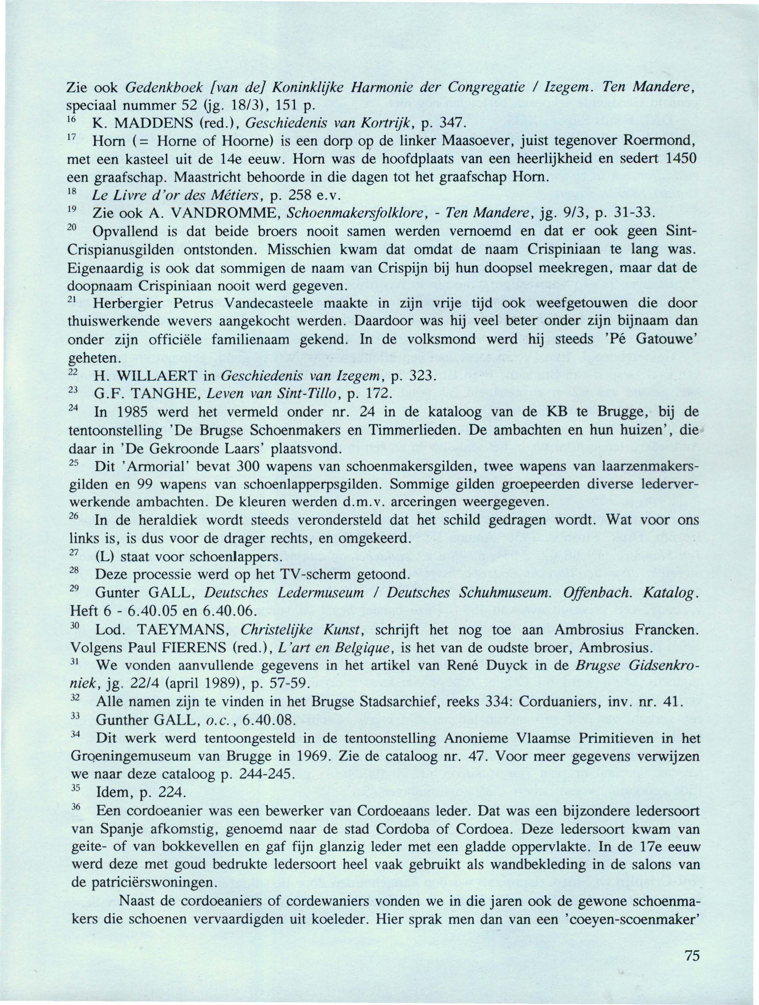 De Brugse schoenmakers en timmerlieden. De ambachteh en hun huizen, XIVde - XXsle eeuw. KB, 1985. Henri PAUWELS . Groeningemuseum. Brugge, Stedelijk Museum voor Schone Kunsten, 1960. Günter GALL. Deutsches Ledermuseum. Kata/og. Heft 6: Deutsches Schuhmuseum. Offenbach, 1980. Stad Brugge & ICOM, UNESCO. Anonieme Vlaamse primitieven. Catalogus. Tielt, Lannoo, 1969. Hendrik WILLAERT en Antoon VANDROMME, Katalogus bij de tentoonstelling Kerkbezit en -interieur SintTillokerk, Izegem 7/8 en 14/.15 september 1974.