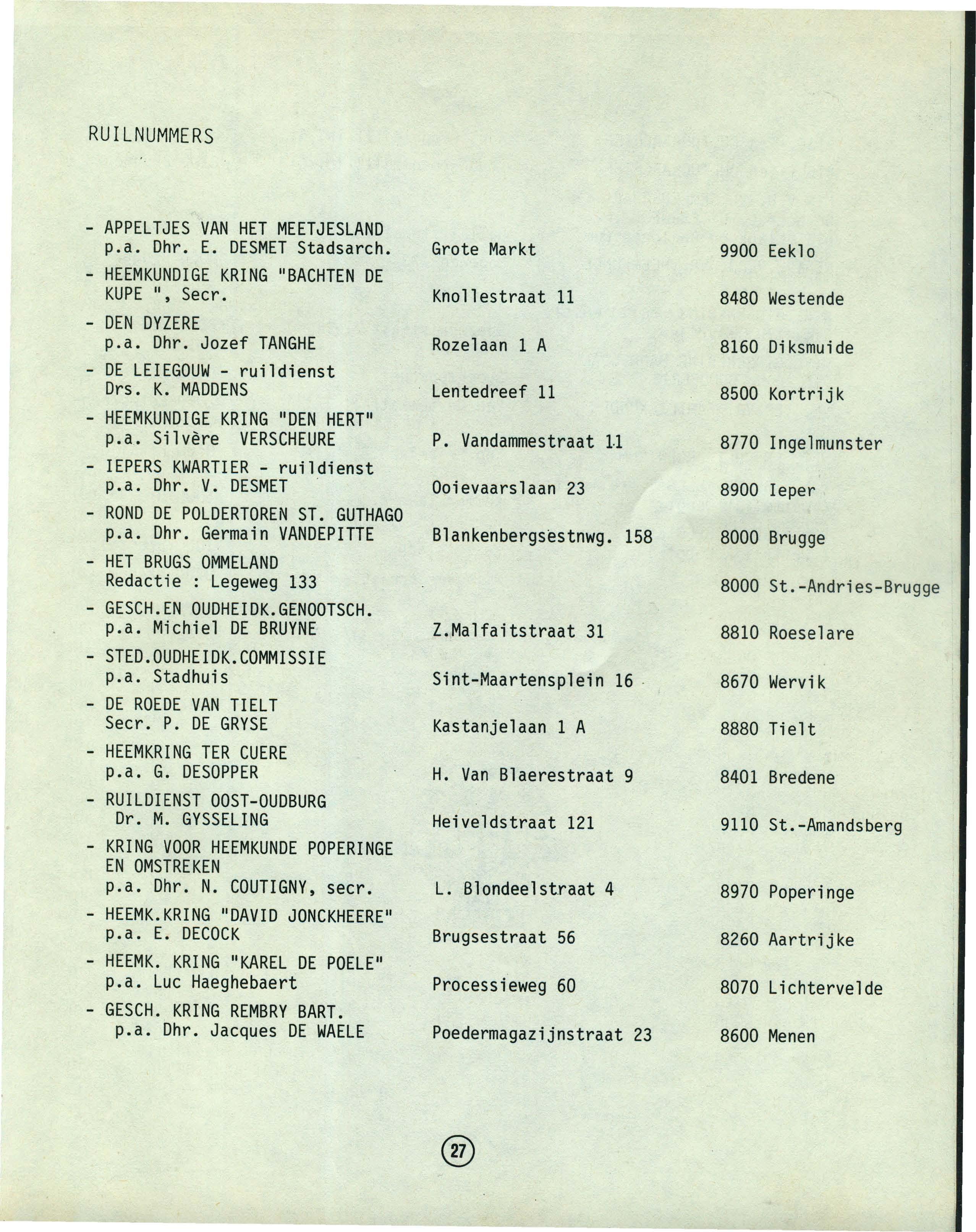 - BlBL.- en CULTUURARCHIEF Kon. Leopold III 1n. 41 8200 Brugge 2 - MIN.V.D. VL.GEMEENSCHAP De heer L. UYTEBROECK p.a. Klank en Beeldcentrum Gallaitstraat 78 1030 Brussel - WESTVL.VERB. VR. HEEMKUNDE · Legeweg 133 8000 Brugge St.Andries