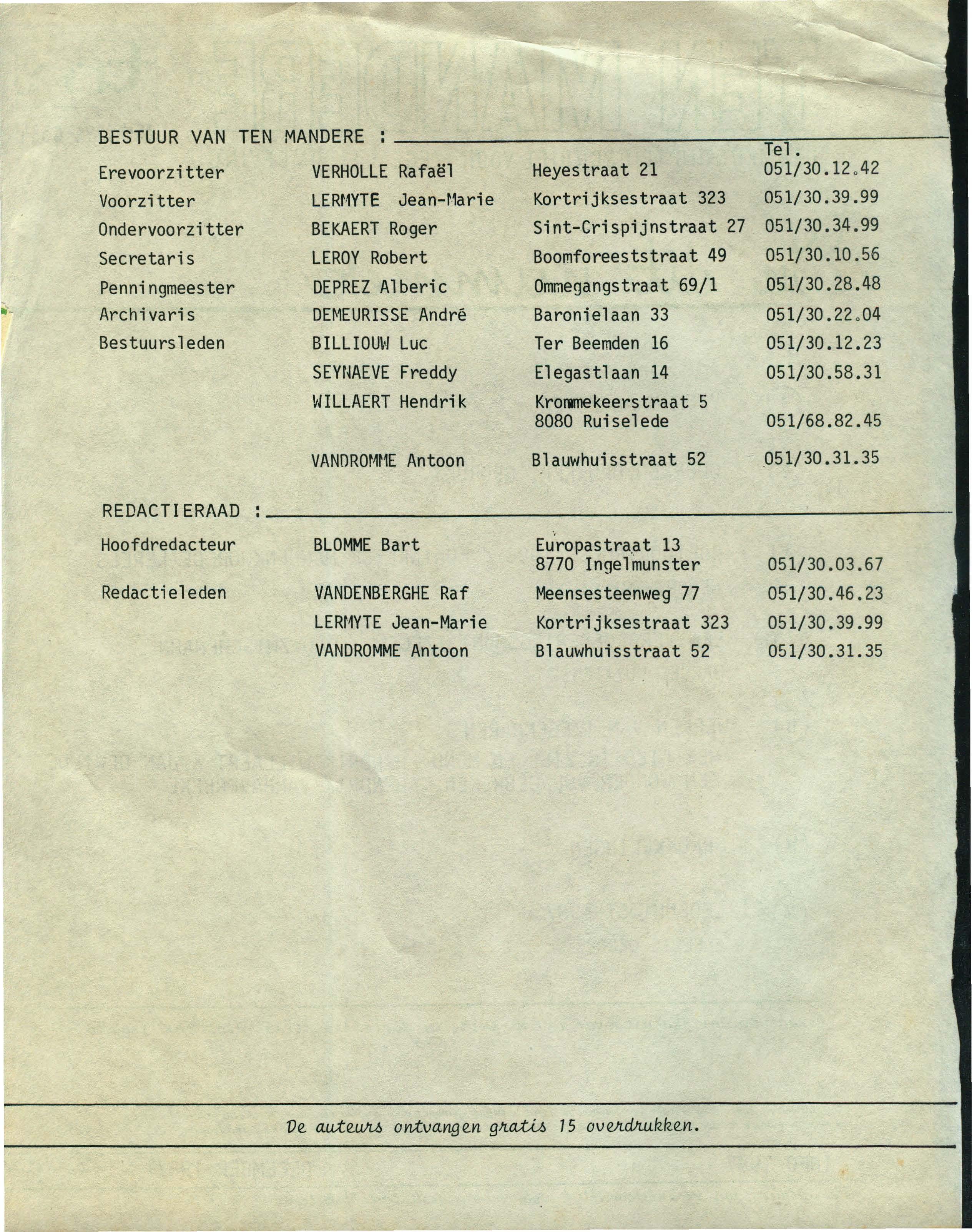 Opnieuw behoort een jaar tot de geschiedenis, maar wellicht is alleen de historicus daar blij mee. Zeker als men al een dag ouder wordt. Ook Ten Mandere is geen drie maal zeven meer. Neen, de heemkundige kring zal zijn 28ste jaargang beginnen! Misschien hoopt elke stichter dat zijn werk eeuwig zal meegaan. Toch is 28 jaar al een hele periode. Wie heeft er een volledige verzameling van Ten Mandere ? Hoeveel mensen , zijn vanaf de eerste dag tot op vandaag ononderbroken lid kunnen blijven? We zouden het eens moeten nagaan. Beste Lezer, we danken U voor het vertrouwen en we hopen dat U alvast van de 28ste jaargang in volle gezondheid zult mogen genieten. We wensen U een goed 1988 toe, lang niet alleen met veel heemkundig genot. Wie kerkelijk is of was weet dat na de beste preken (bijna) altijd een omhaling volYde. Ook wij zijn hier wier. Wilt U a.U.b. zo vlug mogelijk het lidgeld voor de volgende jaargang overschrijven? Het stortingsformulier zit in dit nummer. De prijzen blijven dezelfde 300 fr. voor gewone leden, 400 fr. voor steunende leden en ten minste 500 fr. voor ereleden. Dat we de prijs zo laag kunnen houden, komt omdat er verleden jaar heel wat steunende en ereleden zijn bijgekomen. Het mogen er nog meer worden. Uit dankbaarheid zullen we, zoals vorig jaar, in elk nummer de lijst van steunende en ereleden publiceren. Misschien kent U iemand die interesse kan hebben voor Ten Mandere, maar nog geen lid 15 (zie de adressenlijst in dit nummer). Of misschien doet U zelf iemand een jaargang cadeau? Laat U het ons weten? Om de kostprijs van Ten Mandere in de toekomst zo traag mogelijk te laten stijgen, denken we eraan om voortaan op de binnenkaft voor- en achteraan