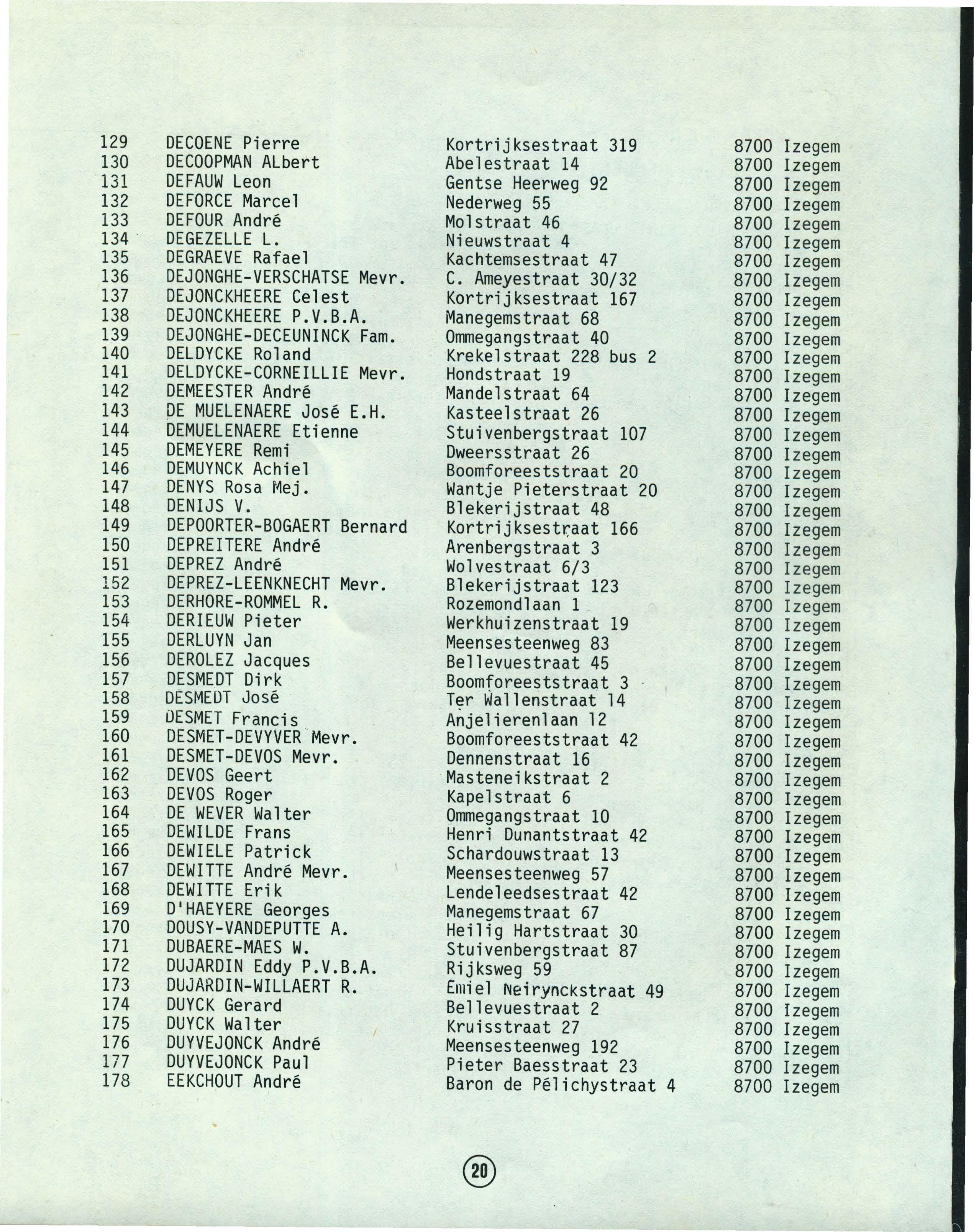 VIAENE Jacques Bremstraat 7 8700 Izegem 361 VIEREN Daniel Dam 10 8700 Izegem 362
