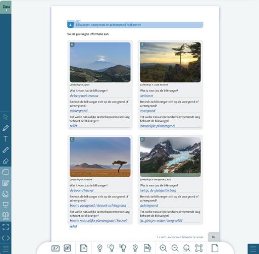 Zone geeft leerlingen de kans om zelf met de lesmethode aan de slag te gaan door middel van: – animaties en instructievideo’s bij de syntheses, al dan niet met controlevragen; – digitale oefeningen om leerstof te oefenen; – Test jezelf in het boek en op Pelckmans Portaal waarmee leerlingen hun kennis op verschillende niveaus kunnen toetsen; – een portfolio met leertips en ruimte voor reflectie; – schrijf- en tekentools waarmee ze ook digitaal tekst kunnen toevoegen, tekenen en markeren.