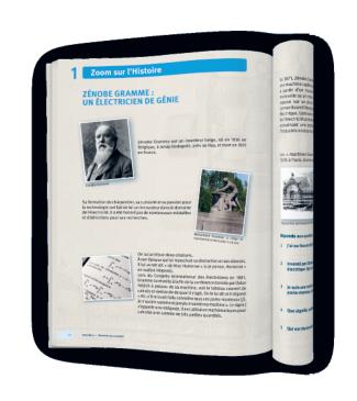 Cette double page croise l’histoire et la technologie en présentant des personnages emblématiques (contemporains ou non) liés à la thématique abordée.