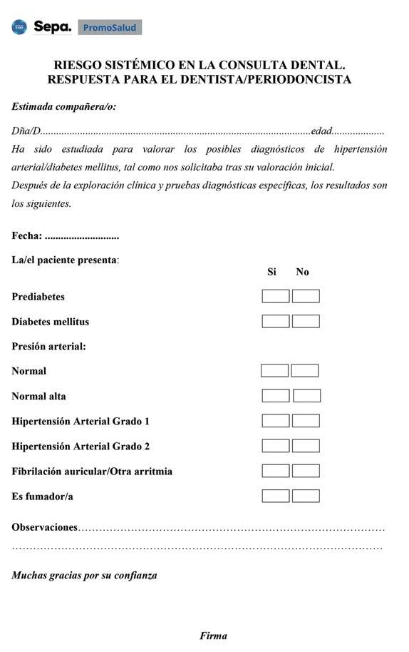 –PROMOSALUD. Recomendaciones SEPA para la detección precoz desde la clínica dental del riesgo de padecer diabetes o hipertensión arterial, por el Dr. Miguel Carasol y cols. [18]