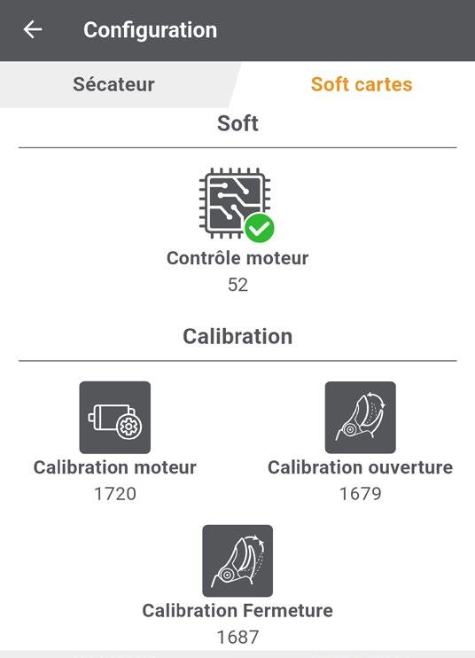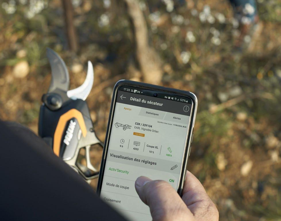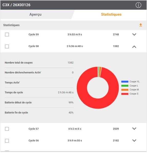 • Sur les sécateurs : Nombre de coupes, leur taille, déclenchement de l'Activ’Security, nombre d'heures avant maintenances.