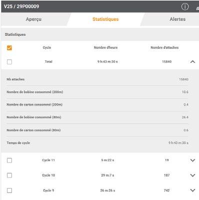 • Sur les attacheurs : Nombre d’attaches effectués sur un cycle d’utilisation, ainsi qu’une consommation du nombre de bobines/cartons associés.