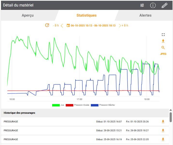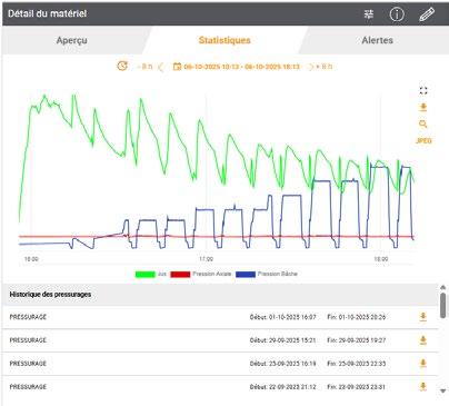 • Historique et export des courbes de pressurage pour analyse et optimisation.