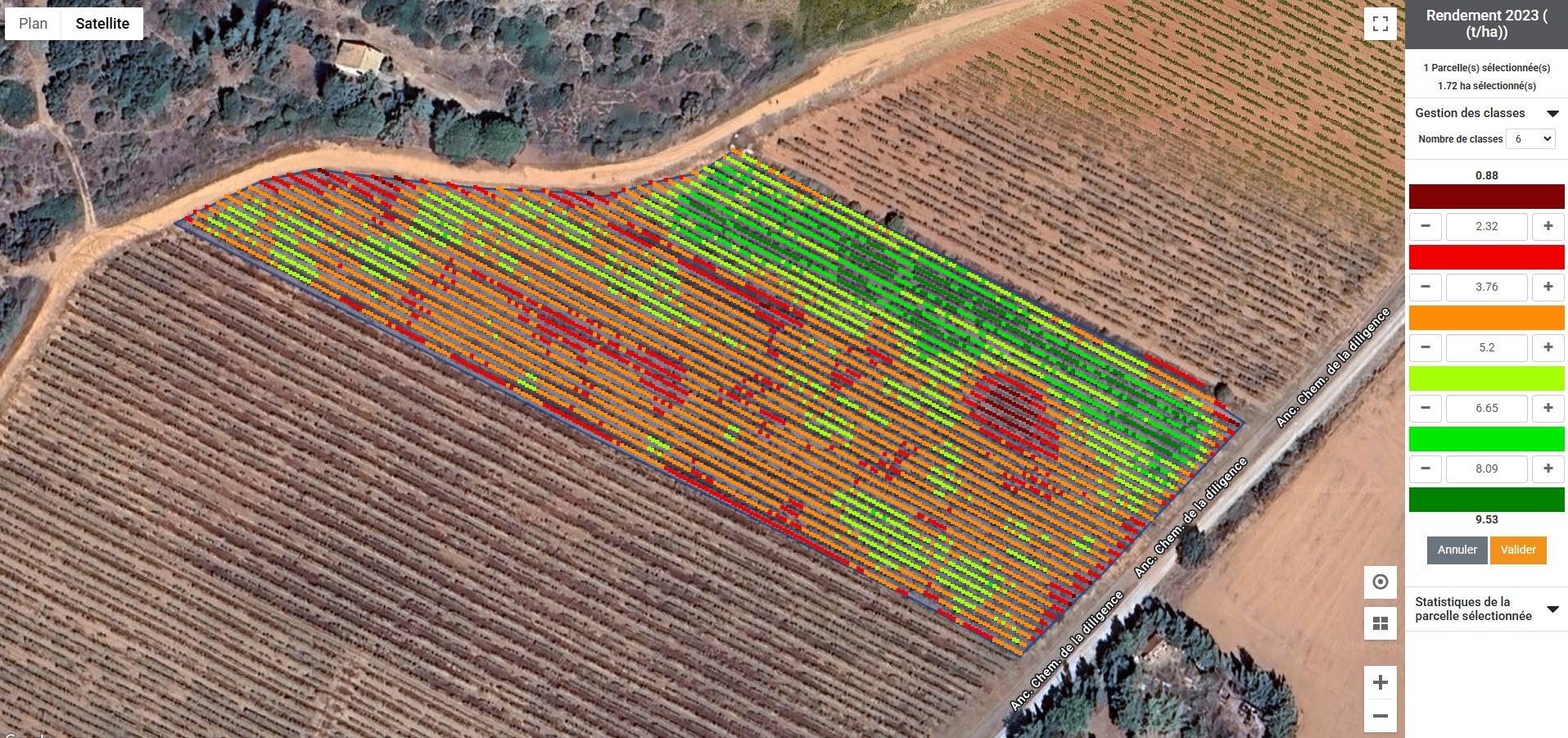 Pour chacune des parcelles récoltées, en complément de la cartographie de rendement PELLENC CONNECT présente des statistiques telles que la date de récolte, la durée de travail, les rendements mini, maxi, etc.