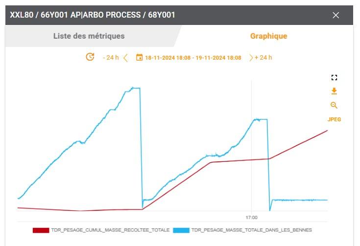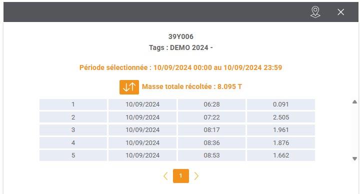 • La quantité de récolte présente dans les bennes, la quantité récoltée et le rendement moyen sur une période donnée,