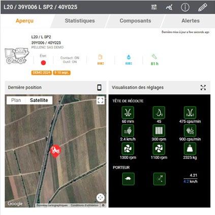 Le suivi de flotte simplifie la gestion des matériels lorsqu’ils sont en fonctionnement. Le suivi du travail en période intensive est également optimisé grâce à l’accès en temps réel aux réglages de la machine et à la supervision du travail effectué (rangs travaillés, restants à faire, etc.).