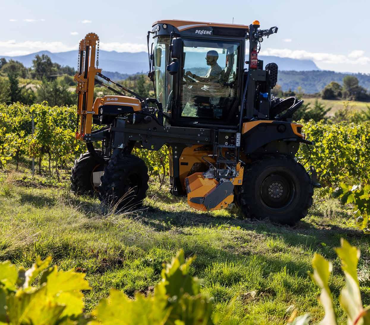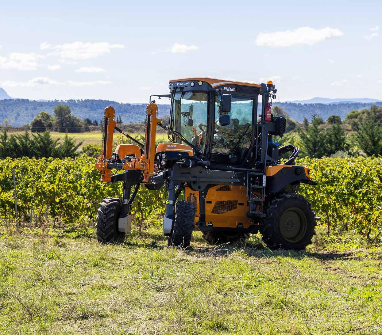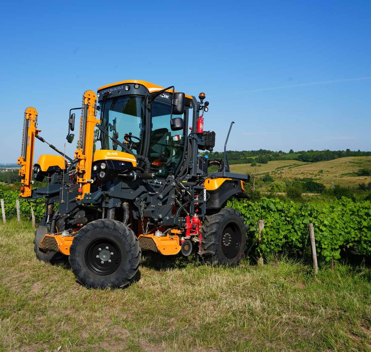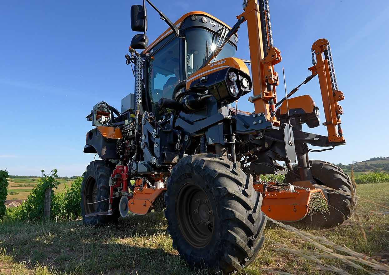 offre un pilotage souple et précis. Grâce à son empattement court, sa voie variable hydraulique et sa capacité à travailler en double ou triple rang, il s’adapte à tous les profils de parcelles, même les plus pentues.