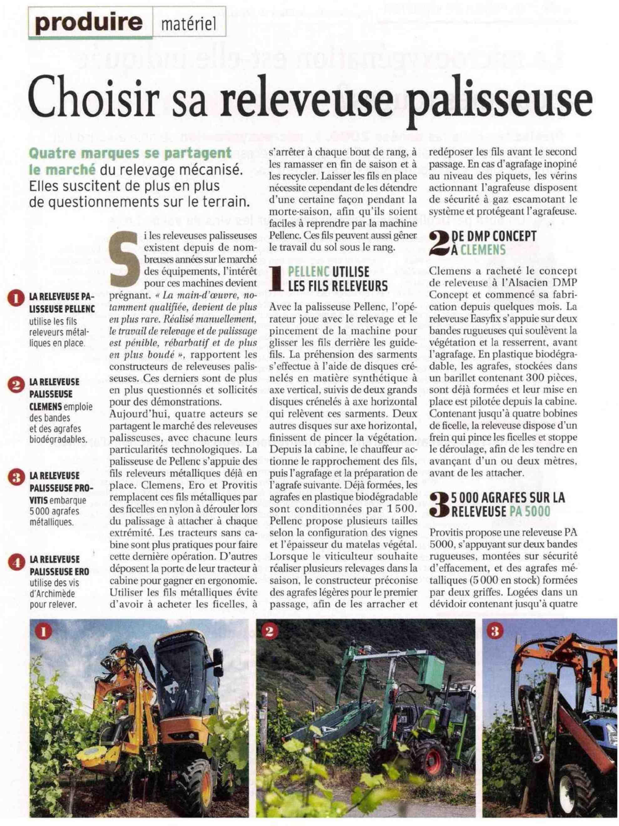 Aujourd'hui, quatre acteurs se partagentle marchédesreleveuses palisseuses, avecchacune leurs particularités technologiques. La palisseusede Pellencs'appuiedes fils releveurs métalliques déjà en place. Clemens, Ero et Provitis remplacentcesfils métalliquespar desficelles en nylon àdéroulerlors du palissageà attacherà chaque extrémité. Les tracteurs sanscabine sontpluspratiquespourfaire cette dernièreopération. D'autres déposentla portedeleur tracteur à cabine pour gagnerenergonomie. Utiliser les fils métalliques évite d'avoir à acheter les ficelles, à