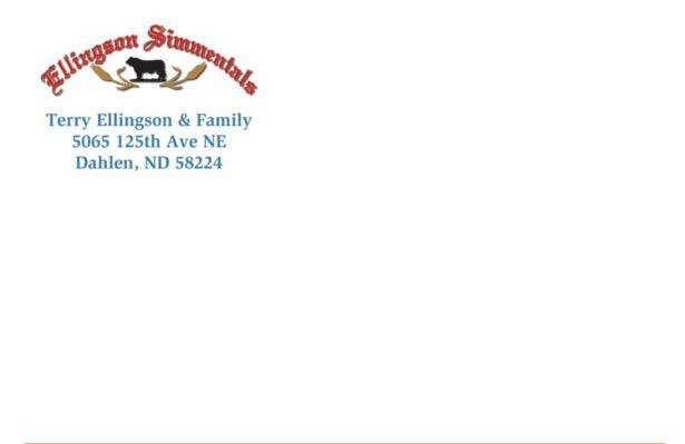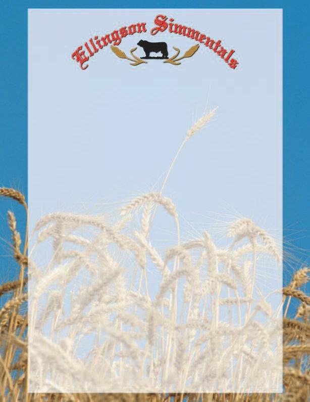 Friday, January 27, 2023 at 1:00 P.M. CST at the Farm • Dahlen, ND Sale Day Phone: 701-741-3045 Terry Ellingson 701-384-6225 or 701-741-3045 • tellings@polarcomm.com Bryan and Jane Strommen 701-430-0669 • bhstrommen@gmail.com Bryan Haugen 701-331-4401 www.ellingsonsimmentals.com Auctioneer Roger Jacobs: 406-373-6124 • 406-698-7686 (cell) Shepard, MT Publication Representatives Jeff Thomas - Farm and Ranch Guide • 406-581-8859 Tony Heinz - Cattle Business Weekly• 701-400-4435 Russ Danielson - ASA • 701 261-2742 Will Bollum- Western Ag Reporter • 507-244-0833 Buyers unable to attend the sale may phone or mail their bids to the auctioneer or representatives listed above Sale Schedule January 1 – 27 View cattle at the farm or on video January 27 11:00 am - Lunch at the Ellingson Event Center 1:00 pm - Performance Bull and Female Sale Terms of Sale All sales are cash on day of sale. Conditions of Sale All animals are sold in accordance with guidelines of the American Simmental Association Copies are available at the sale Volumn Discounts Purchase two bulls- 2%, three bulls- 3% discount, four bulls 4% discount, five bulls and over 5% discount No discount on heifers Health Comments Ellingson/Strommen