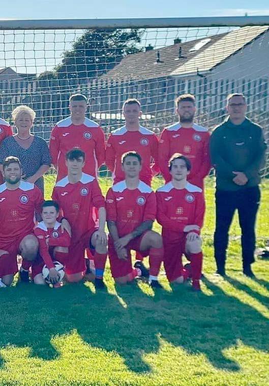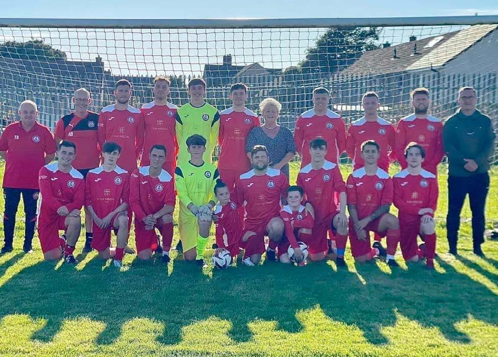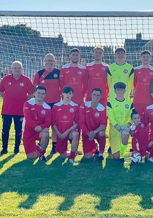(Assistant Coach,) Andrew Burgoyne (First Aider,) Daniel Armstrong, Jacob Horn, Liam Davies, Scott Reid, Steven Parks (1st team Manager.) Front row: Sam Davies, Griffiths (Club Captain,) Noah Codd (mini Robin,) Liam Parks, Joe Hall, leuan Rutherford
