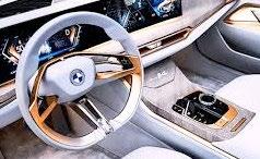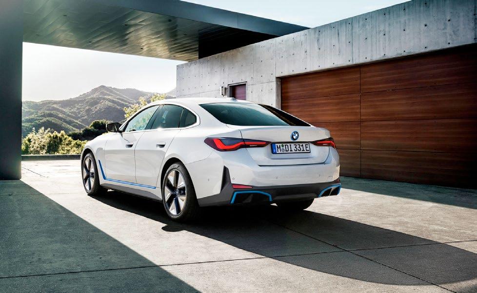 Inside, the i4 balances luxury and sustainability with rose gold trim, white leather uphol-