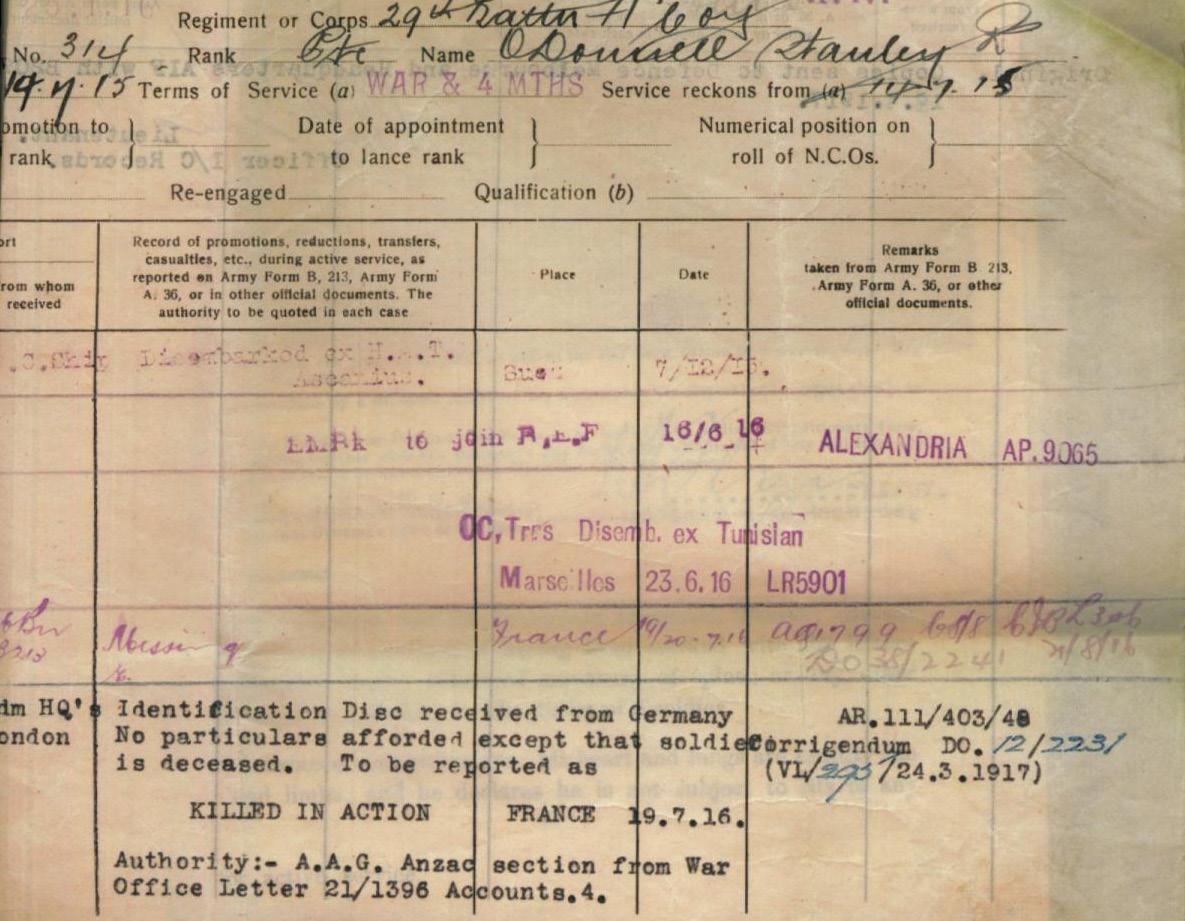 Stanley’s first encounter with the Germans was the disastrous Battle of Fromelles on 19 July 1916; he was subsequently posted as “missing”. A statement was given to the Red Cross by a fellow soldier from the 29th Battalion (Private James Westwood) who was wounded at Fromelles. He stated: “…on the night of July 19-20 at Fromelles he saw O’Donnell, whom he knew personally, hit and afterwards saw his body lying there. He is quite sure from personal knowledge that O’Donnell was killed.” (AWM: Red Cross Wounded and Missing Files)