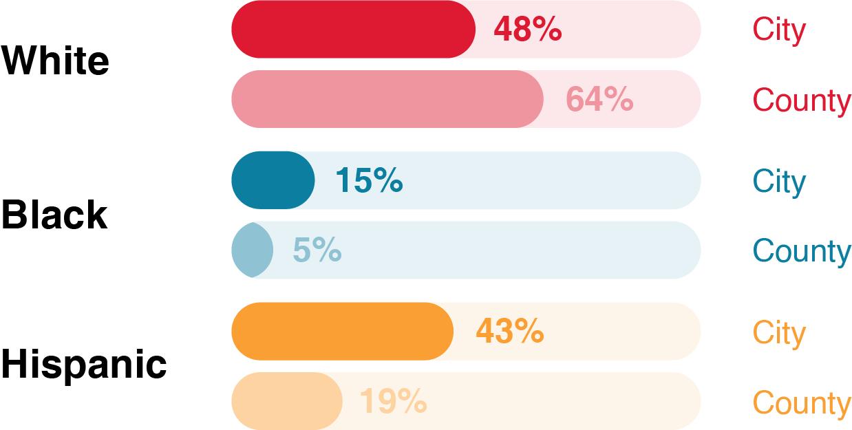 Compared to the county, Lancaster City is younger, more racially diverse, and less affluent. The median age is 32 versus 39 countywide and has smaller households on average. Lancaster also has a lower share of married families or families with children. Compared to the county, educational attainment and median household income are both lower and the unemployment rate is nearly three times higher. The county has a higher rate of car ownership: 62% of household have more than one vehicle compared to 40% in the city.