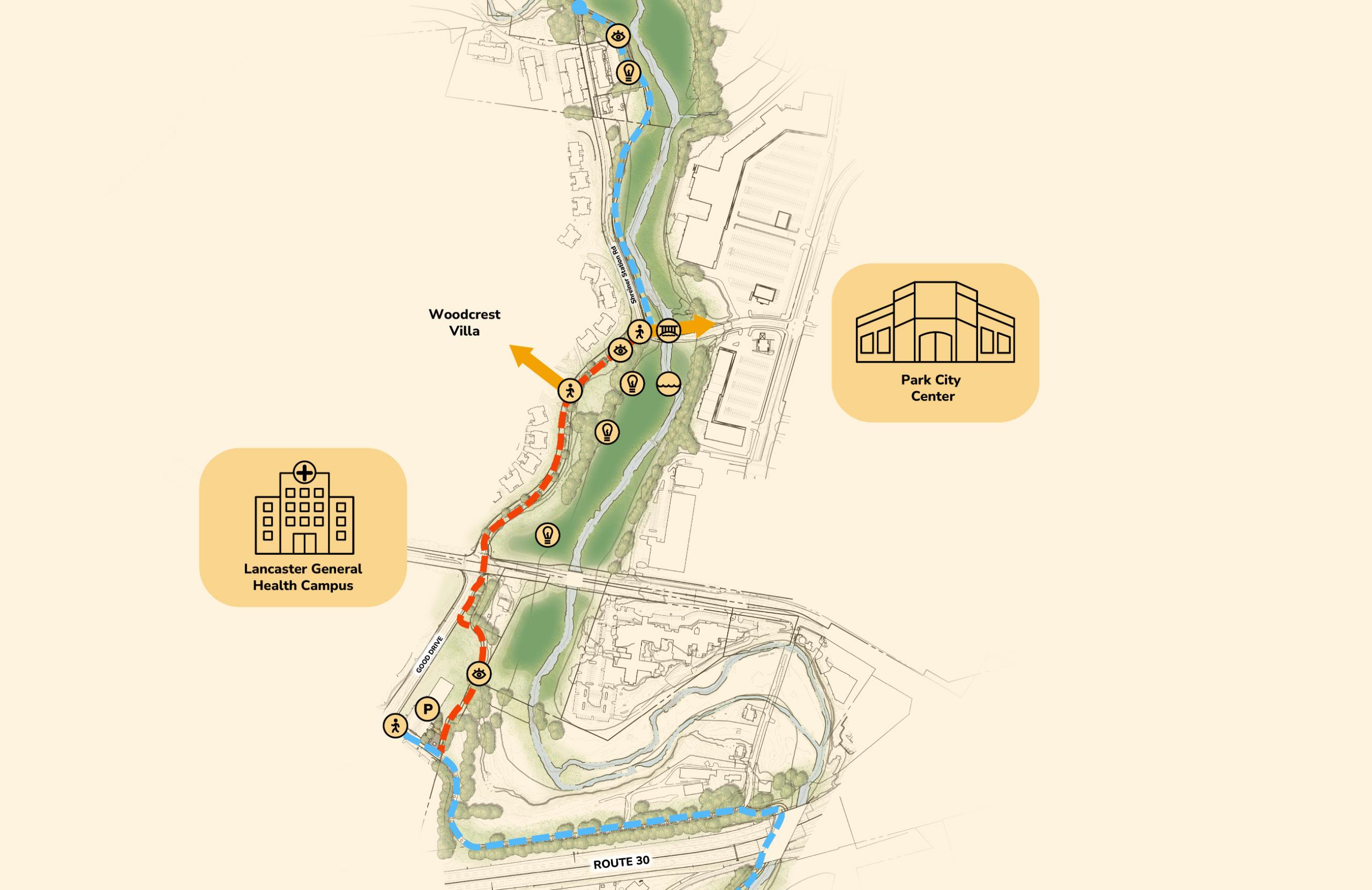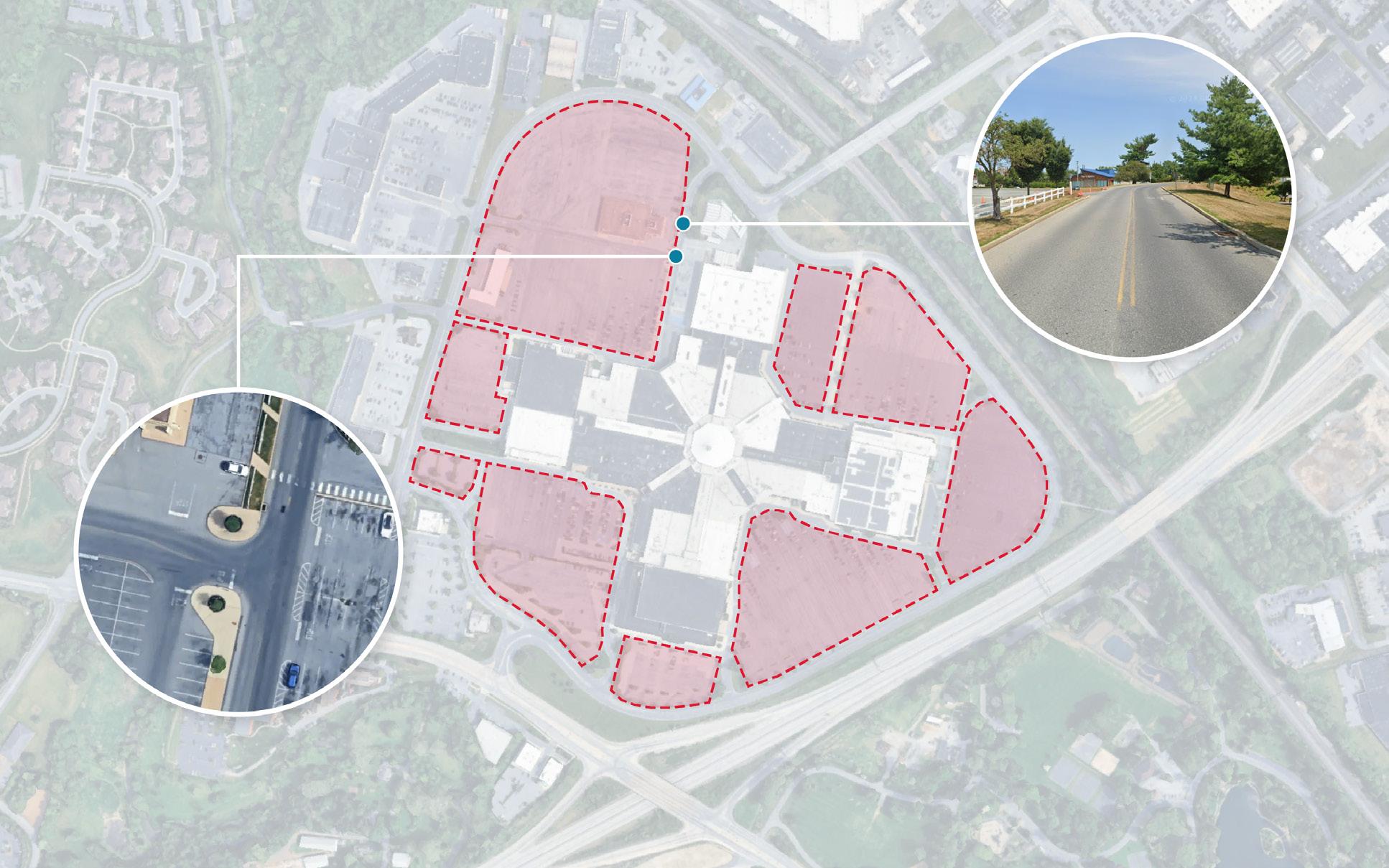The current layout for Park City Center features a classic suburban mall design—a large building footprint surrounded by expansive parking lots. Park City is adjacent to Long’s Park and close to the planned Blue Green Connector trail system along the Little Conestoga Creek. There is an existing pedestrian underpass connecting Park City and Long’s Park, but walkability is still limited and very hard to find with the limited signage. To the west, across Plaza Boulevard, Park City’s ring road, are Parkview Plaza and several restaurants and the Blue Green Connector—indicating opportunities for pedestrian crosswalks to provide better connectivity.