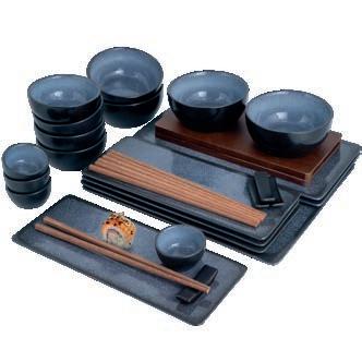 bestehend aus Sushi-Platte, Sushi-Teller, Miso-Schale, Schälchen, Bambusuntersetzter und Ess-Stäbchen aus hochwertigem Porzellan und Bambusholz div. Farben pro Set