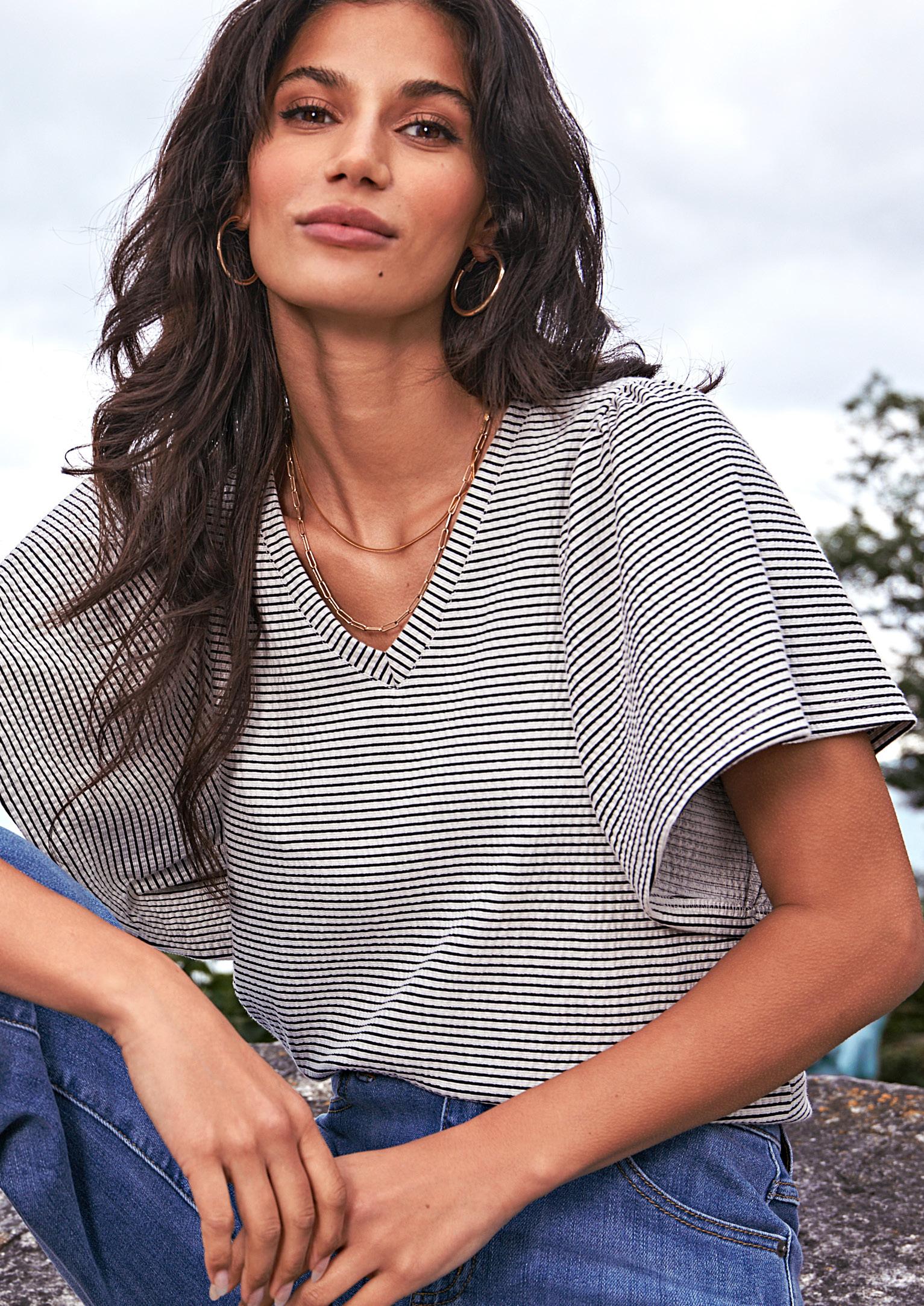 ARIEL SHORT SLEEVE FLOUNCE TEE, FLORENCE HW LONG JEANS