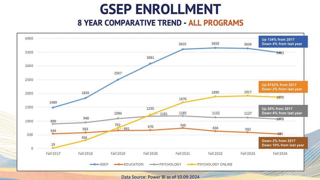 This surge in graduates follows an almost 10,000% for the Psychology Online programs and 135% across GSEP enrollment over the past eight years, significantly bolstered by the integration of online program offerings. These results reflect a rise in mental health awareness and the urgent need for trained professionals, as well as the leadership and dedication of admissions and enrollment director, Karen Magner, and her team of recruitment officers and processors.
