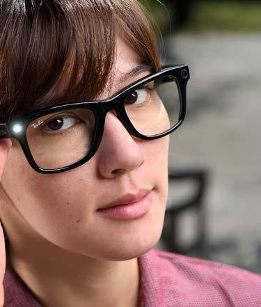 Left, Pepperdine IT’s Emerging Technologies Analyst Kiana Felker demontsrates a pair of wearable Ray Ban smart glasses which integrate technology for hands-free photo/video capture, audio playback, communication, and AI assistance.