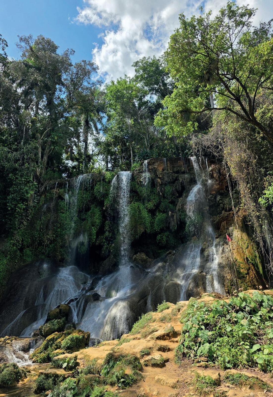 drogi przesiadamy się do małych busów, które wiozą nas przez wiejskie tereny Kuby do parku narodowego Topes de Collantes. Wędrujemy łatwym szlakiem „Reino de las Aguas”, mijając bujną roślinność, kładki i wodospady – najpierw Poceta de los Enamorados, później główny wodospad i punkt widokowy z panoramą na góry Escambray i jezioro Hanabanilla. Na koniec kąpiemy się w lodowatej wodzie wodospadu Poceta de Cristal – zabawa jak u dzieci!