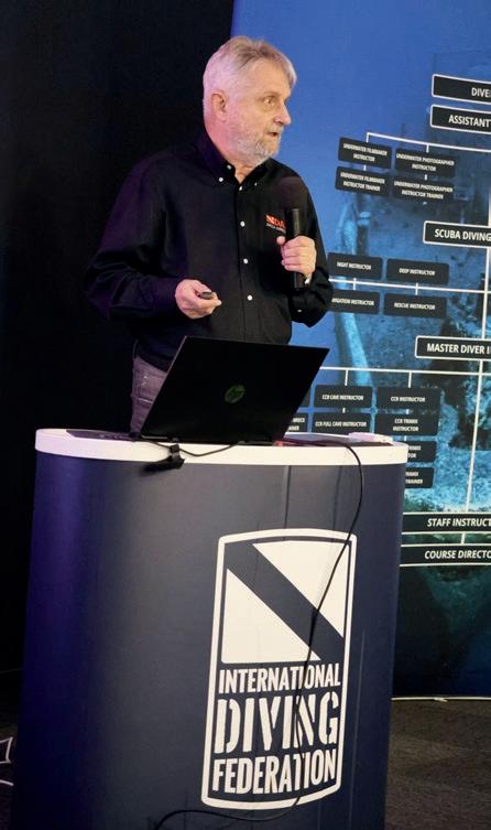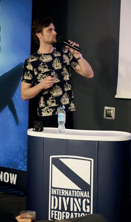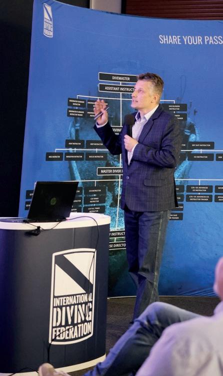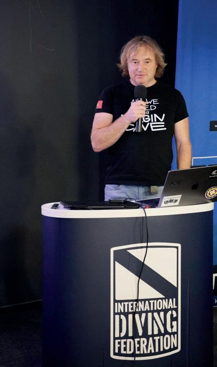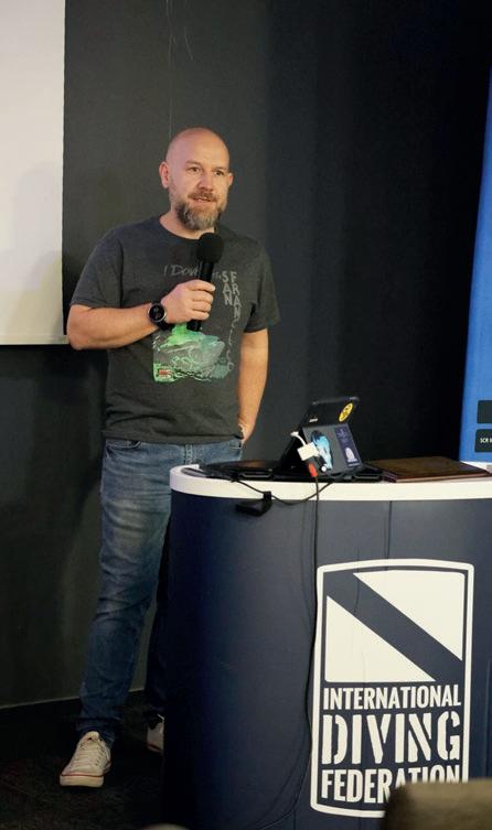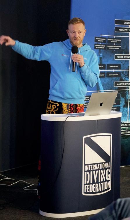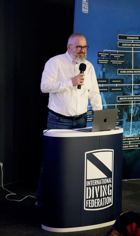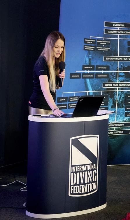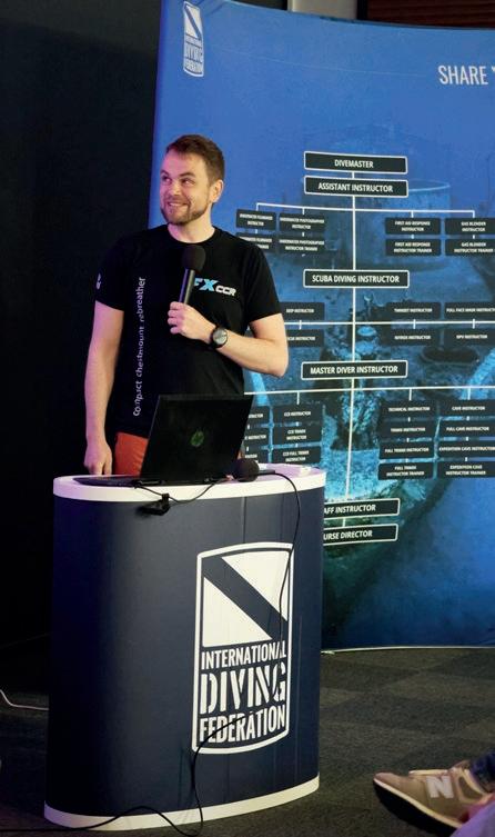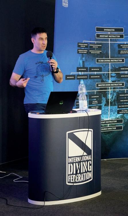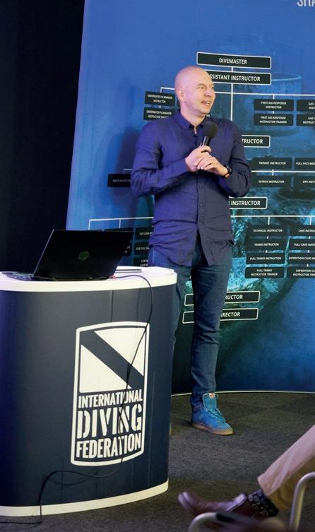 instruktorów. Podczas swojej prezentacji wręczył nagrody zasłużonym członkom federacji, podsumował zmiany organizacyjne i możliwe ścieżki rozwoju nurka oraz przybliżył plany na nadchodzący czas, również odnośnie nowych podręczników, których do tej pory wydano 17, a które zawierają skondensowaną wiedzę teoretyczną, pomagającą zdobyć nowe kwalifikacje. Wszystkie te podręczniki prezentowała Daria Dobrowolska na stoisku, gdzie można było zakupić dowolny podręcznik.