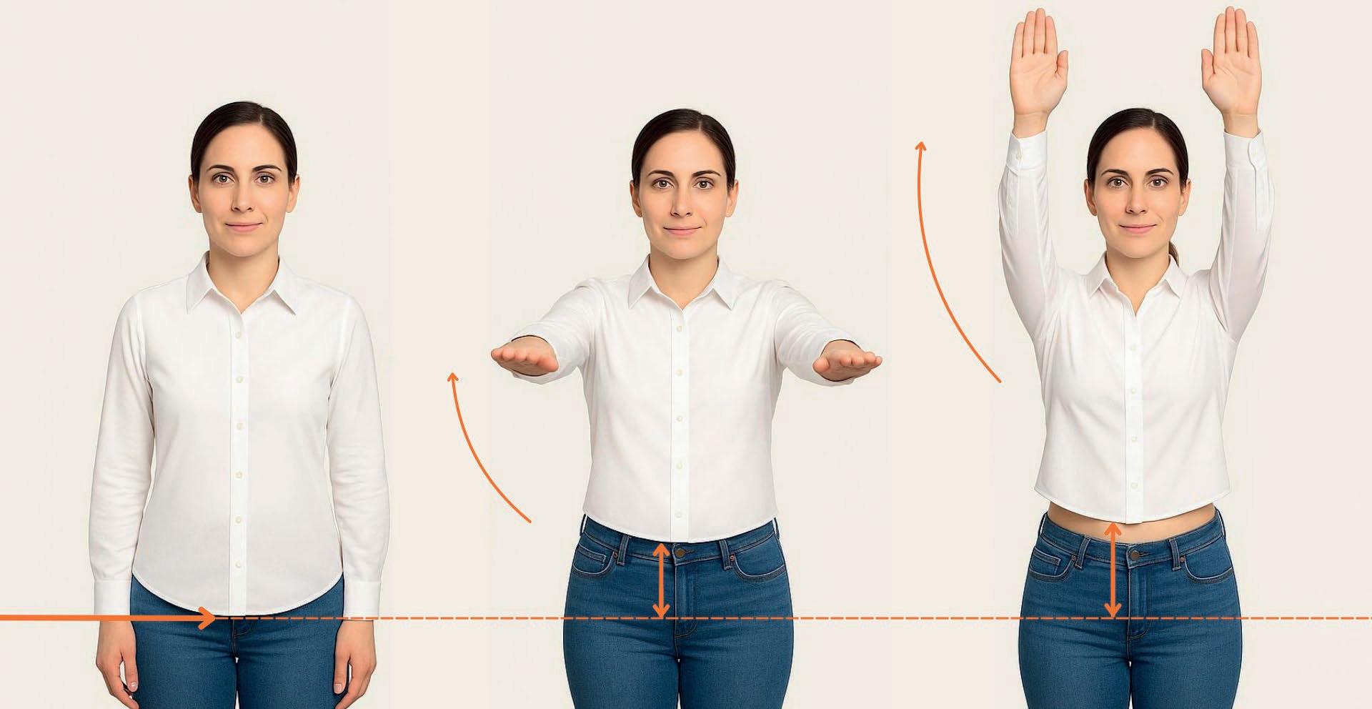 Opuść ręce do pozycji wyjściowej, a partnera poproś, żeby zapamiętał miejsce, do którego sięga koszula – wyspecjalizowana metoda polega na tym, że partner przytrzymuje w tym miejscu swój palec