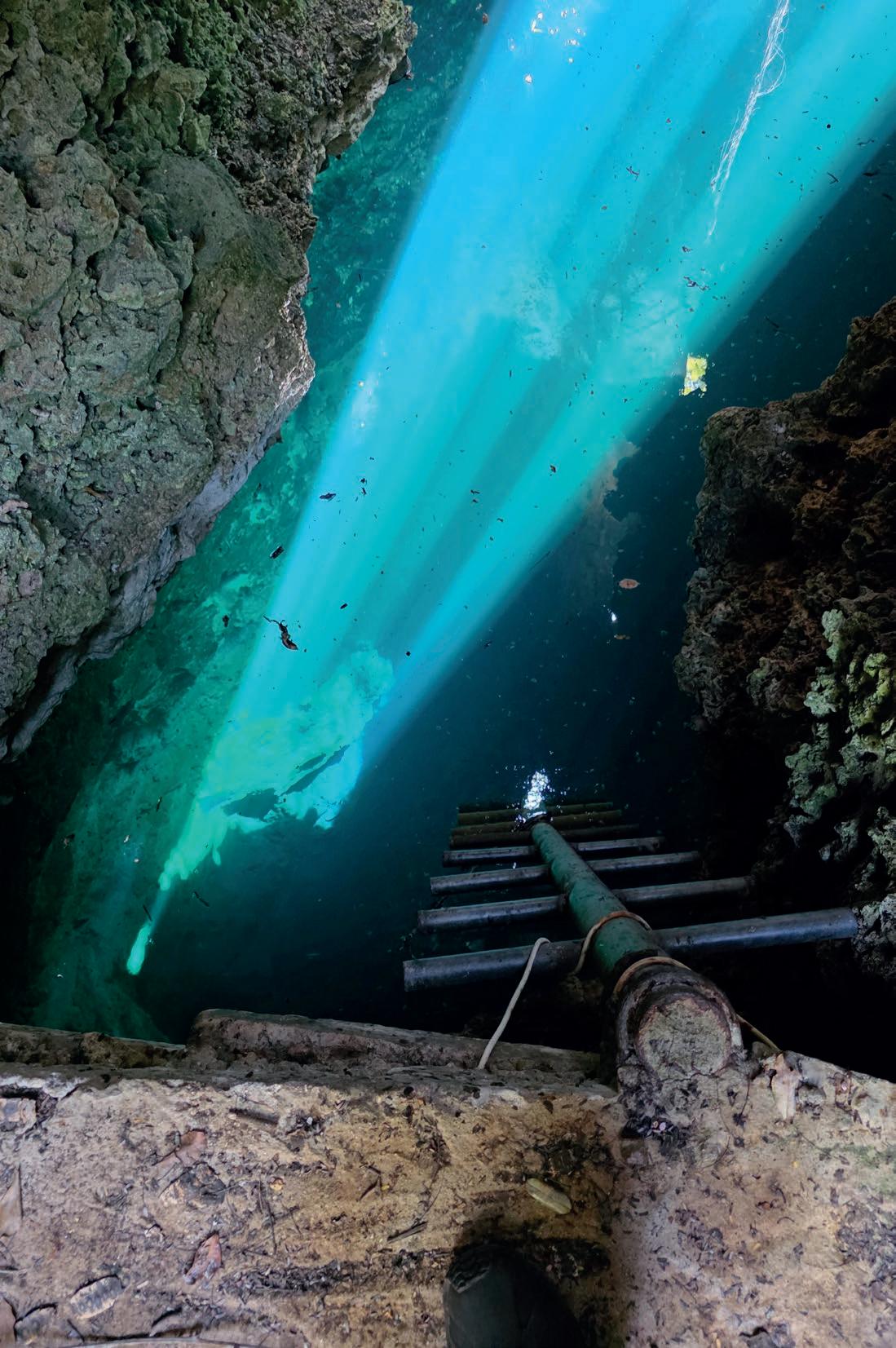 zaskoczyło nas pięknie oświetlone wyjście z jaskini. Przepływaliśmy przez haloklinę, która znowu zapewniła nam ekscytujące wrażenia. Na 5 metrze robiąc przystanek bezpieczeństwa czas umilały nam krewetki przyczepione do ścian. Wyjście z jaskini było trudne więc zdjęliśmy sprzęt w wodzie i po skałach wdrapaliśmy się do góry. Poskładaliśmy sprzęt, zapakowaliśmy go na wóz a sami udaliśmy się w drogę do drugiego miejsca nurkowego przez środek kubańskiej dżungli. W drodze towarzyszyły nam kraby wychodzące ze szczelin w skałach, mijaliśmy wiele „oczek wodnych”, w których były żółwie i krokodyle. Po dotarciu na miejsce okazało się, że jest jeszcze bardziej fascynujące. Po skalnych schodkach musieliśmy zejść w dół, żeby zobaczyć błękit wody oświetlonej przez słońce. Zaczynamy nasze drugie nurkowanie, żeby nie było za prosto, trzeba skoczyć z półki skalnej jakieś 2 metry w dół pomiędzy dwoma skałami. Po raz kolejny zanurzamy się w błękitną wodę, aby odkrywać jaskinie z cudowną grą świateł. Dopływamy do bardzo szerokiego miejsca, gdzie jaskinia ma jakieś 40 metrów głębokości ze spektakularnie czystą i przejrzystą wodą. Niestety nie możemy zejść na sam dół więc zostajemy na około 30 metrze i podziwiamy ją na tej głębokości. Oczywiście tutaj również miesza się woda słodka ze słoną i znów możemy podziwiać zjawisko halokliny. Kiedy kończymy nurkowanie czeka na nas drabinka, po której musimy się wdrapać na wysokość ok 2 metrów i schodami do góry wychodzimy na powierzchnię.