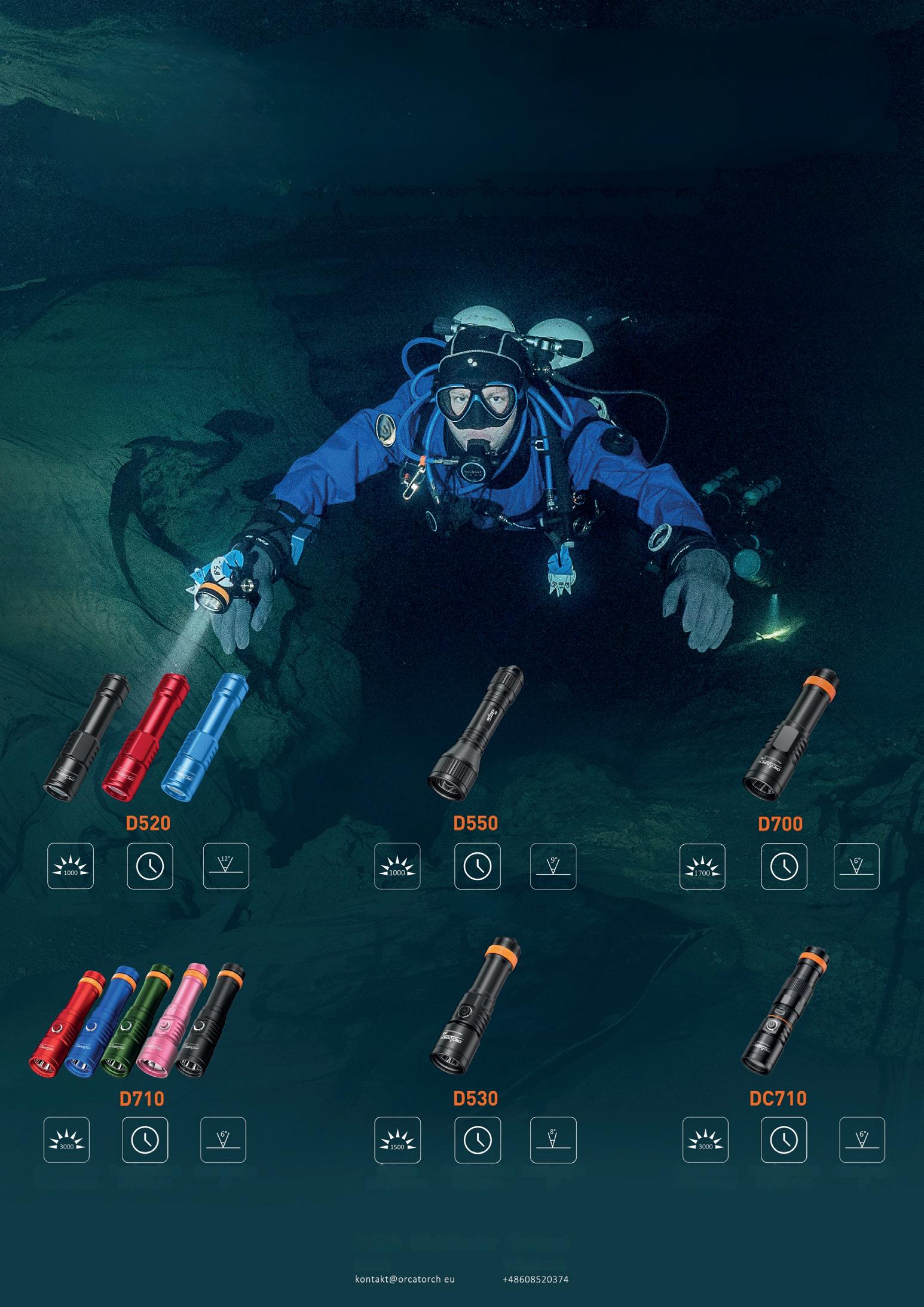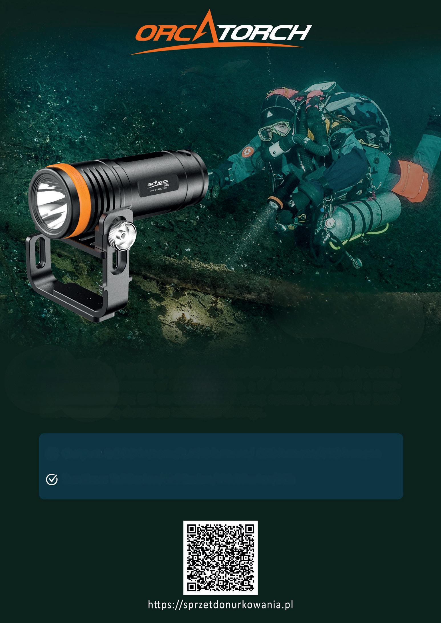 OrcaTorch D920 to nowoczesna, bezprzewodowa latarka główna do nurkowania o maksymalnej mocy 5000 lumenów , wąskim kącie świecenia 9° oraz intuicyjnym magnetycznym przełączniku tylnym i systemie ładowania.