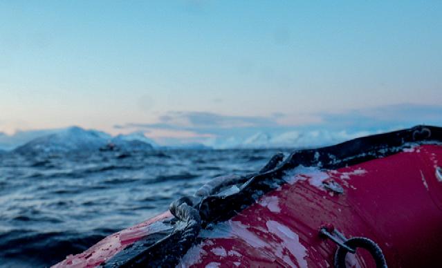 suddenly emerge from the stormy water. Sometimes we stood on the deck at -16°C for hours trying to spot at least one whale. Limited daylight, waves, wind and a large area made finding killer whales a real challenge. Once the black and white predators were spotted, all of us got into the RIB in full readiness. The skipper swam as close as possible to the animals and when we managed to find a family of killer whales who were curious about our presence, we went down calmly into the water. It was important to calmly and slowly enter the water and then