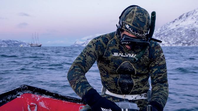 nieprzytomne ofiary, sztuka po sztuce. Ciekawe jest to, że orki nie połykają śledzi w całości. Każdą rybę z osobna podgryzają u nasady głowy i poprzez odpowiedni zacisk odgryzają tylko część ryby pozostawiając głowę oraz ości w wodzie. W listopadzie norweskie wody mają 4°C, na zewnątrz temperatura sięga -15°C i często wieje wiatr. Przy takich warunkach, kilka godzin na RIB’ie, w mokrej piance brzmi jak szaleństwo. Ciało szybko traci ciepło i bywa naprawdę zimno. Jednak jeżeli wytrzyma się spartańskie warunki i ma się danego dnia szczęście to nurkowanie swobodne wsród orek jest doświadczeniem istnie magicznym. Fotografka Julia Ochs, która była na pokładzie tak opisała to zdarzenie: „Wchodząc na RIB’a, byłam przygotowana na to, że przez najbliższe godziny nie będę czuć palców rąk i nóg. Wiedziałam, że tylko siła umysłu może pomóc mi przezwyciężyć drastyczny chłód. Przy -16°C i mroźnym wietrze nie było wątpliwości, że będzie niesamowicie zimno. Zwłaszcza gdy nosisz mokrą piankę o grubości 5 mm kombinezon. Wiedziałam, że gdy wejdę do wody i pojawią się orki zapomnę o zimnie. I tak właśnie było.”