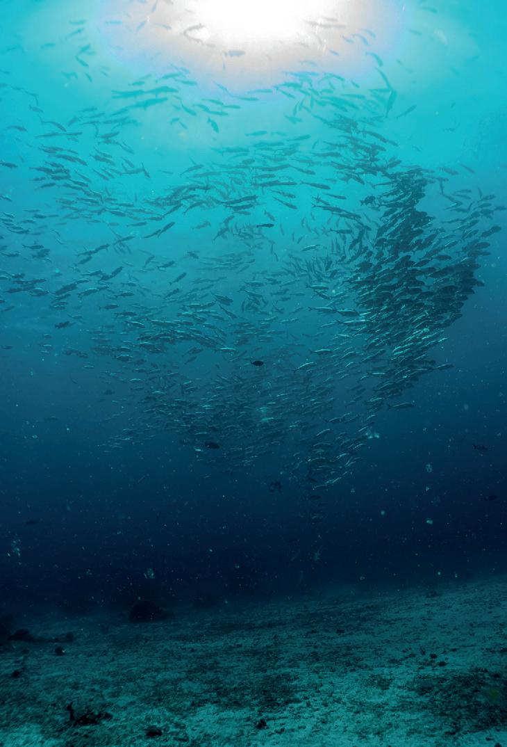 cze czarnopłetwe. To, co początkowo wygląda na dwa lub trzy towarzyskie lucjany, przekształca się w nagły wir aktywności 10.,20.,30. lucjanów. W sekundę krawędź rafy zamienia się w chaotyczną burzę ryb! Snappery przesuwają się, zmieniają kształt tworząc jedną całość. Woda aż „tętni życiem”. Jednak dopiero pod koniec nurkowania tworzą jeden, gigantyczny organizm. Są jednością. Kiedy ryby takie jak lucjany rozmnażają się masowo, zalewają ocean… plemnikami i jajami. Zapłodnione jaja, które uciekną drapieżnikom, są wysysane przez prąd wprost do otwartej wody, gdzie zygoty (przyszłe małe rybki) mają szansę uro-