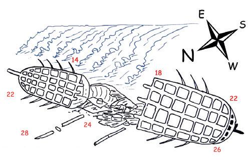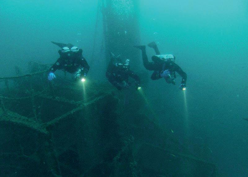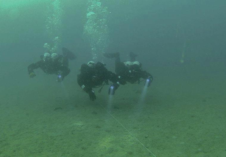 ● Use a strobe and compass to teach communication: A strobe hung on a line slightly above the wreck line is easy to locate when the general direction to the descent line is known. Maximum effectiveness in difficult conditions can be achieved using a strobe with irregular flashes.