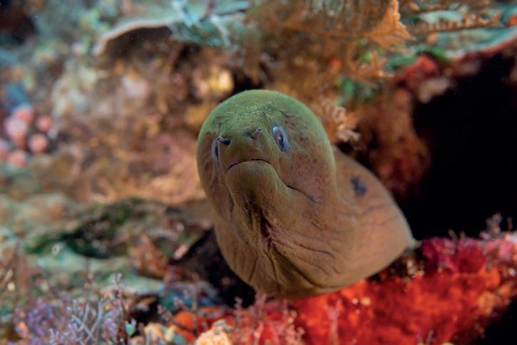 schon vom Boot aus, bevor man überhaupt abgetaucht ist :) Unter Wasser kann man verschiedenen Rochenarten (Kurzschwanz- und Langschwanzstechrochen sowie Adlerrochen) und Haien (Teppichhaien oder Bronzehaien) begegnen, sowie Muränen, Conger (Meeraalen), Schnappern und vielen, vielen anderen. Für Liebhaber der Makrofotografie ist es ein buntes Schneckenparadies, von dem man den Blick nicht abwenden kann. Dazu kommt, dass all dies von wunderschönen Wänden und Felsformationen umgeben ist, die mit Schwämmen, Anemonen, Gorgonien und einem Kelpwald bewachsen sind. Die Vielfalt der Farben und ihre Sättigung verursachen fast ein Flimmern vor den Augen, und man beginnt sich zu fragen, ob es Traum oder Wirklichkeit ist, wobei man nur zu einem Schluss kommt: Jacques Cousteau hatte recht. Die Landschaft der Poor Knights Inseln wird von riesigen Höhlen und zahlreichen Felsbögen geprägt, die durch die Erosion des Vulkangesteins entstanden sind. Die meisten haben breite Eingänge und werden gut mit natürlichem Licht angeleuchtet, was auch Sporttauchern ein sicheres Durchtauchen ermöglicht. Die größte von ihnen, die Rikoriko Cave, gilt als die größte Meereshöhle der Welt und ist eines der charakteristischsten Elemente des Archipels. Die Bögen und