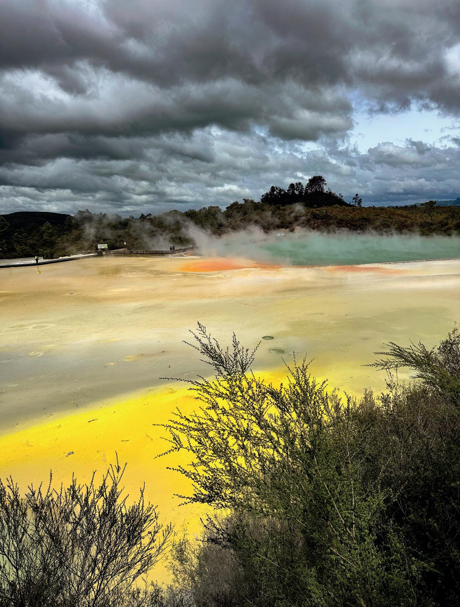 Die Nordinsel Neuseelands liegt an der Schnittstelle tektonischer Platten, was sie zu einem der geothermisch aktivsten Gebiete der Welt macht. In der sogenannten Taupō Volcanic Zone kann man Geysire, blubbernde Schlammkessel, heiße Quellen und dampfende Erdspalten beobachten. Der bekannteste Ort ist die Gegend um Rotorua, wo geothermische Phänomene fast im Stadtzentrum auftreten. Tatsächlich stoßen wir beim Spaziergang durch die Gegend auf Schilder, die warnen, die markierten Wege nicht zu verlassen, da die Erdoberfläche sehr heiß sein kann. Hier und da steigt aus Wiesen und Gräsern eine Dampfwolke auf, die uns daran erinnert, dass die Schilder nicht lügen.