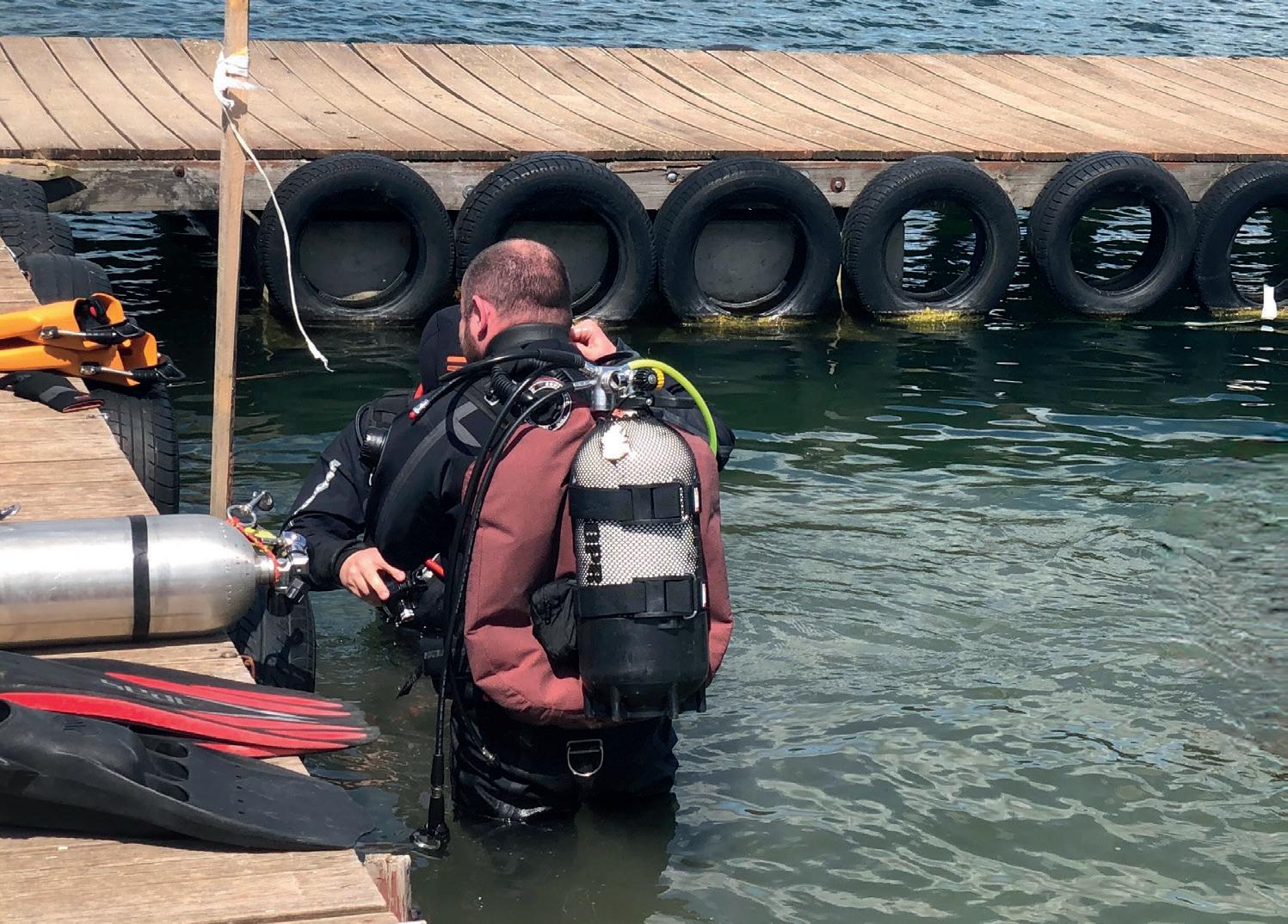 Jedes Teammitglied, das sieht, wie sich sein Tauchpartner so dreht, achtet auf Gefahren durch verlorene Netze oder Angelschnur im Bereich von Kopf und Ventilen.