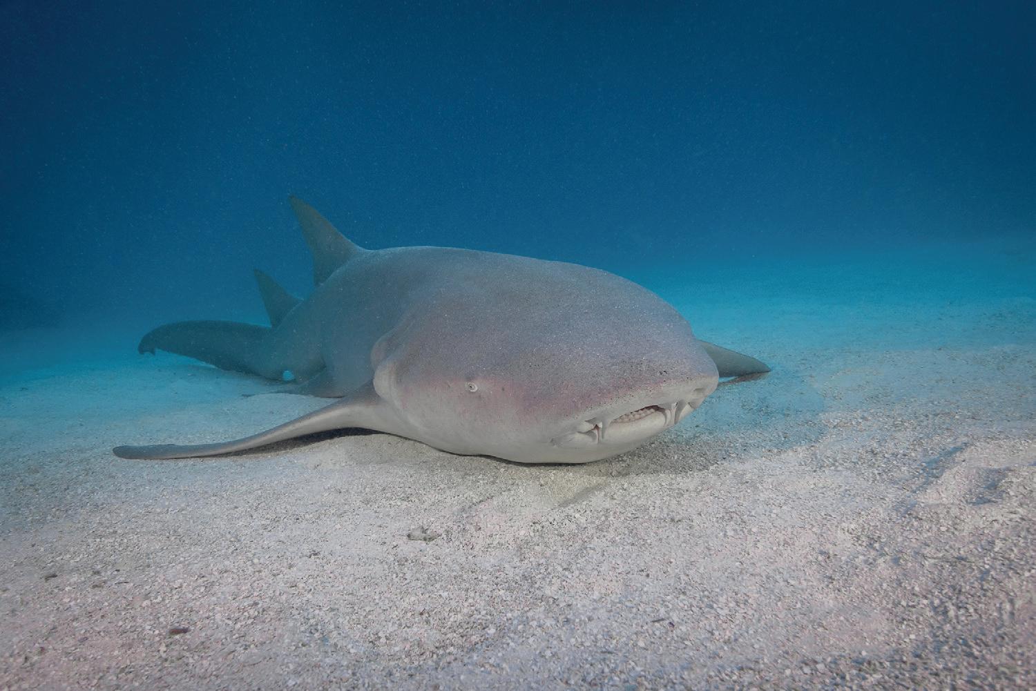 Their powerful bodies are covered with placoid scales, rough to the touch, with a texture resembling coarse fabric that resists the fingers. Looking at nurse sharks – some of the ocean’s most understated, yet charming creatures – I notice their heavy, powerful silhouette and their relatively small mouth. Inside are about three hundred small teeth arranged in several rows. These are not used to tear prey apart, as in other sharks, but to grasp and crush hard-bodied prey such as crustaceans, crabs, and sea urchins, which make up the foundation of their diet.