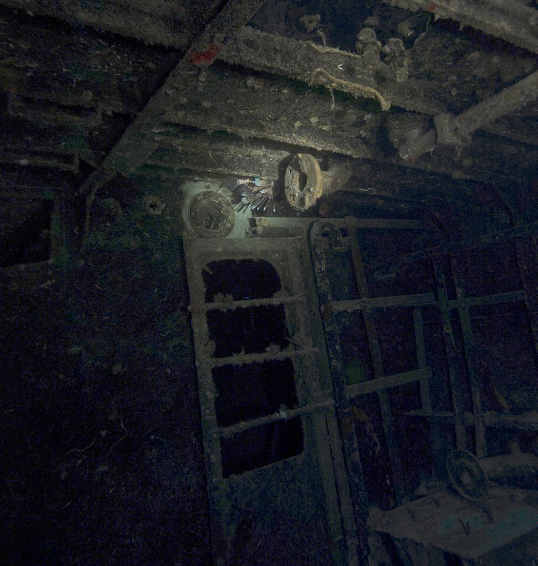 The interior of the wreck is also available and its penetration is relatively easy. All windows have been removed from the “saloon” deck, so natural light reaches the interior. You can swim to the machine room or exit through the front windows. The machine room itself holds an intact engine (it’s usually better to be the first diver in rather than the last one). Bringing a torch here is a good idea, as this is the darkest place in the wreck.