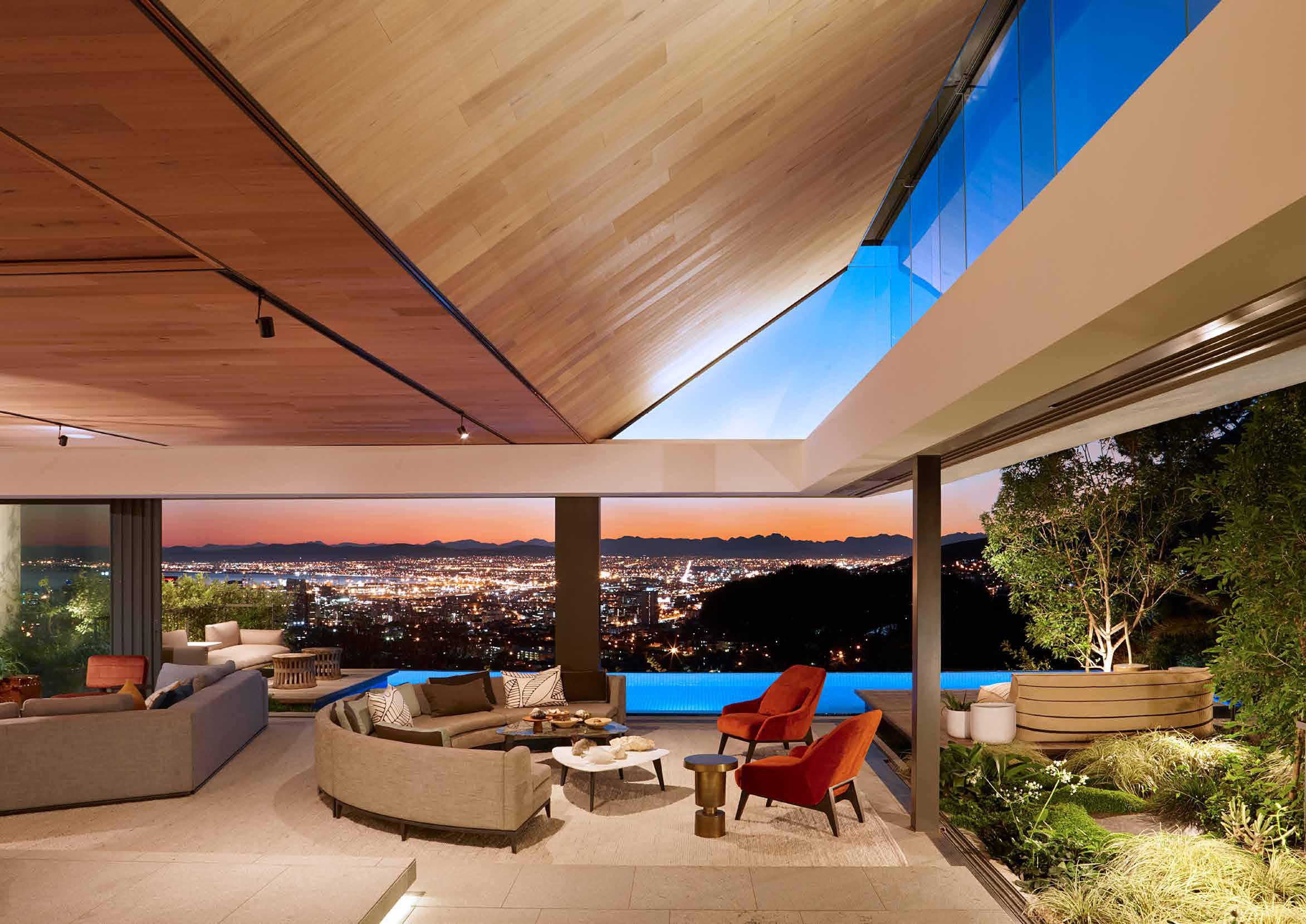 The strength of the home and the backbone in its brilliance is the eternal flow of natural light, and its liberty to fall and rest dependent on the season. The landscape moves through the transparent divides of the home, nurturing the relationship the build has with nature and its surroundings. That early morning brew – on the deck, beside the pool, watching the sun rise over the city – is an entirely different view to that of the end of the day. When the moon starts to rise, and the lights of the city come to life. A revolving exhibition space, if you like. A depiction of the city, its colours, its life, its temperament interchanging. Cape Town, in all her glory, is on display throughout the hours of the day from every pocket of this magnificent home, adjacent the mountain, overlooking the ocean, in the heart of the city.