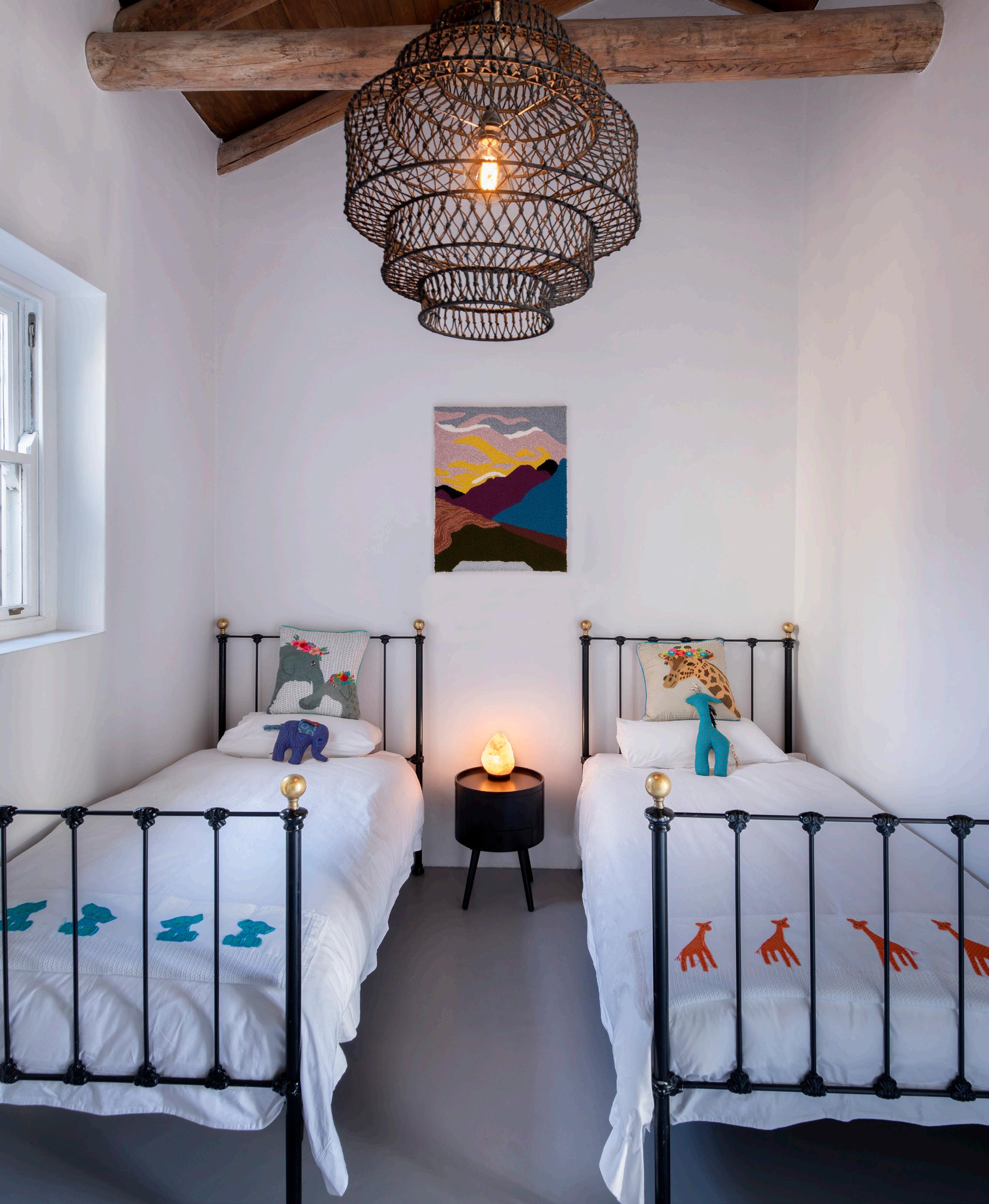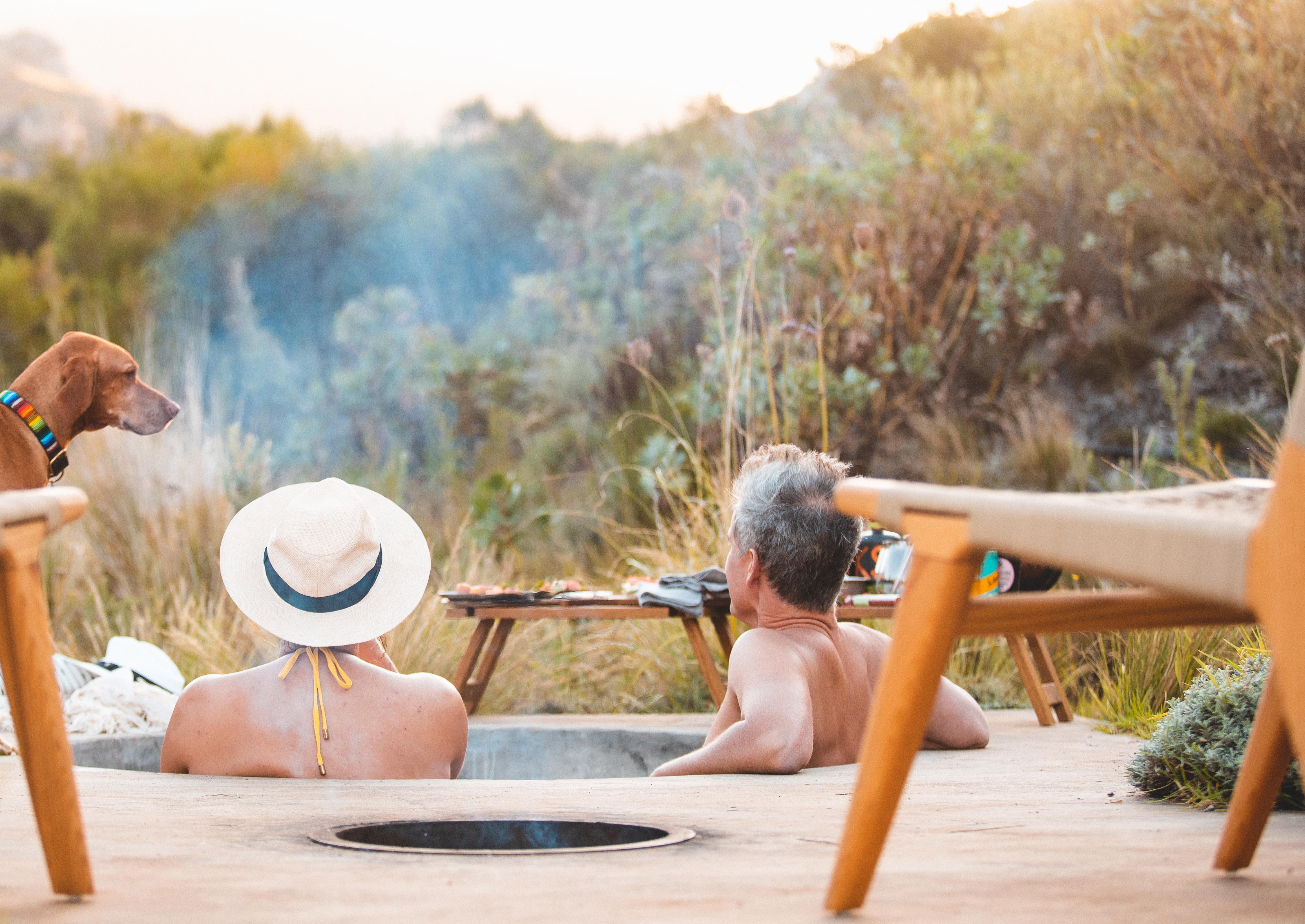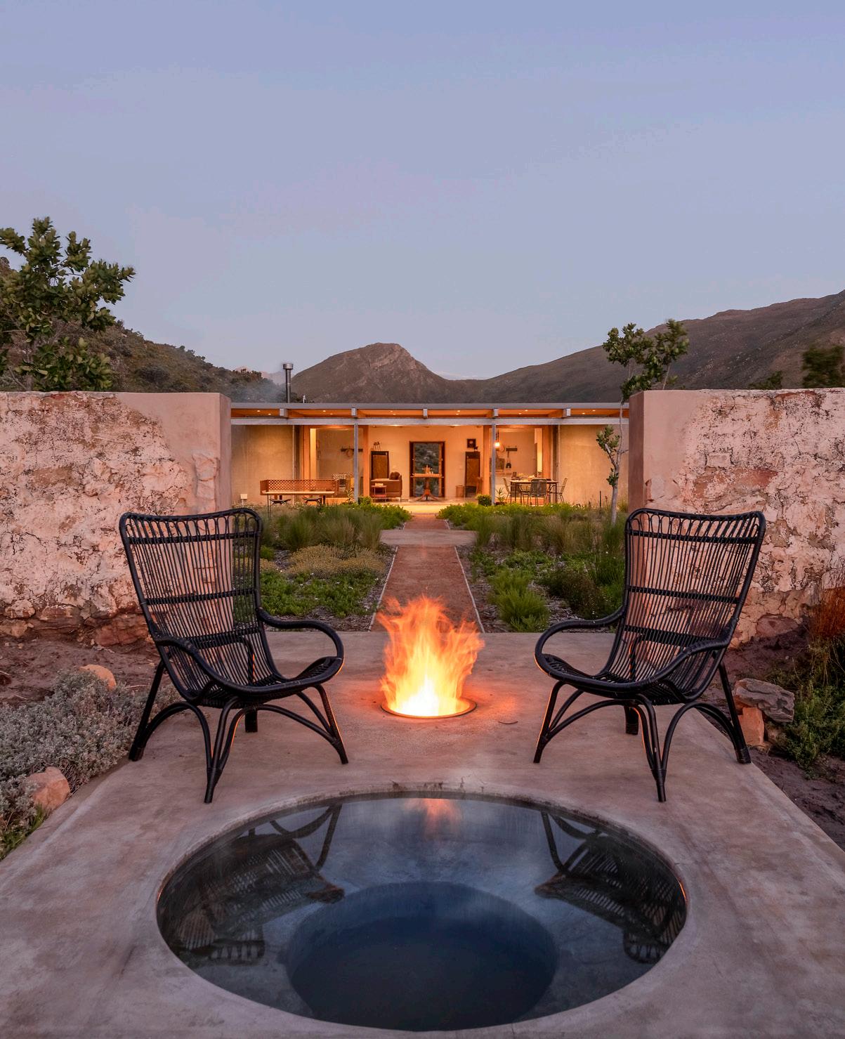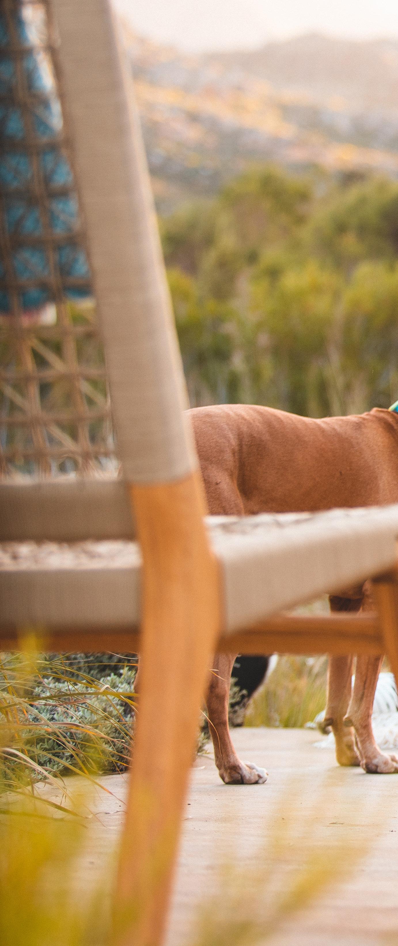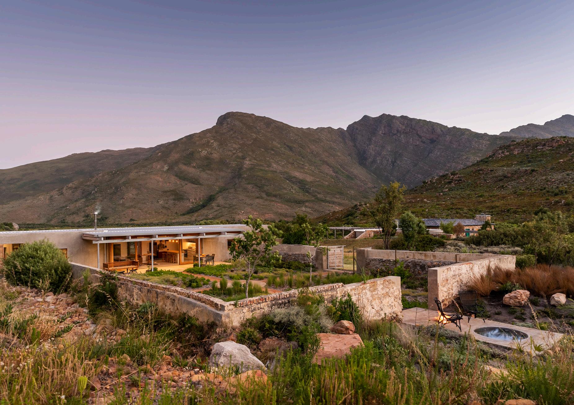 Out to the heated swimming pool, the pavilion where the long table sits beside the fireplace, beneath the pergola looking up towards the mountain peaks. Meander your way past the donkeys and the chickens, through the gardens towards the front wooden door of Mapacha, where nature’s narrative ensues. A two-bedroomed en suite cottage, with generous open-plan spaces that lead out through large glass sliding doors to a wild bedded oasis of medicinal herbs and succulents, more fynbos and overgrown grasses. Mapacha, which means ‘twin’ in Swahili, is the perfect appendage to India House. Where pathways lead you to a wood-fired hot tub, bubbling beneath the open skies, and up into the mountains.