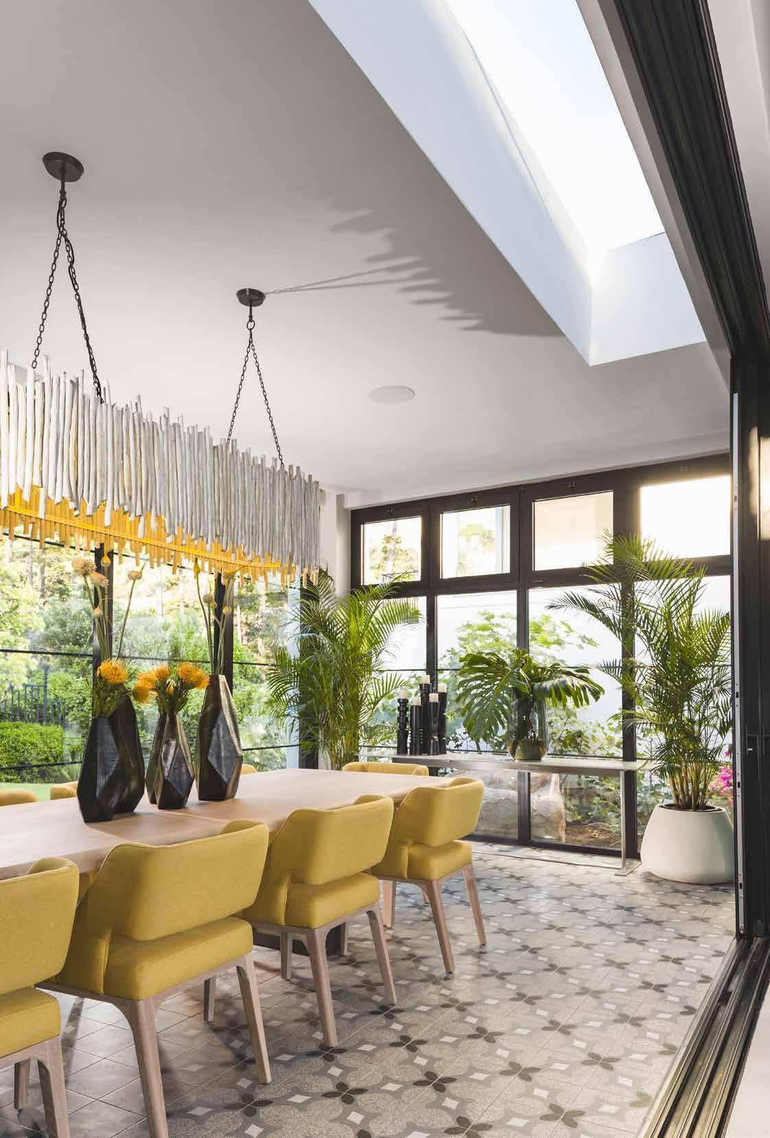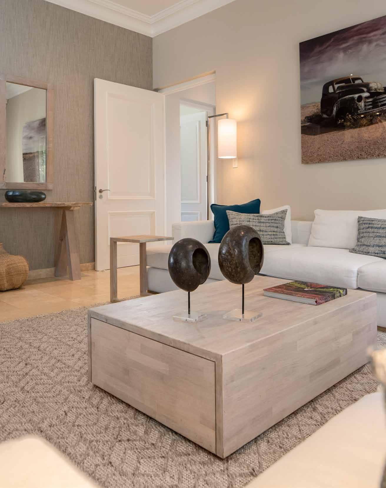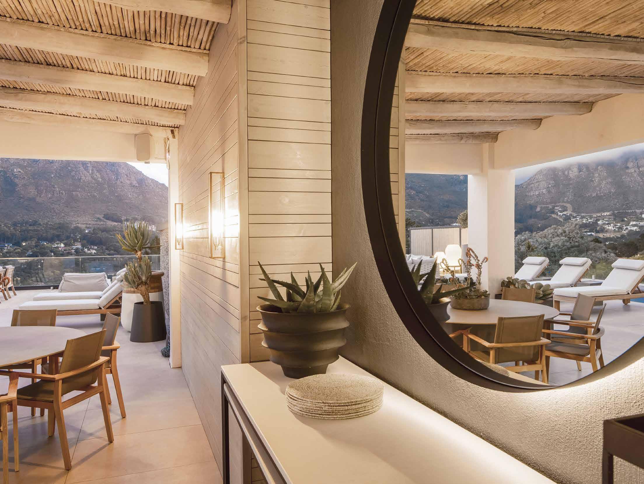 Samadhi – which means harmony in unison with spirit and soul in ancient Sanskrit – gently cascades down the undulating slopes of indigenous wild and manicured gardens into tiers of boundless entertaining, living, reclining and dining spaces. The moment you enter through the antique Indian doors, and climb the staircase towards the main living areas, expansive views of the mountain, the valley and the ocean envelope you and draw you out in a blissful state of wonderment. Though the mountains remain still, they are everchanging in colour and temperament. The enthralling exhibitions of statement pieces of art – by Dylan Lewis and Lionel Smit – an impressive collection of prints by photographer Freddie Child Villiers, and bespoke pieces of furniture crafted by Andrew Dominic, are all in keeping with the sentiment of refined luxury, layered textures and a modest elegance. Each piece of furniture, placed with intent and function are gushing with comfort and caliber.